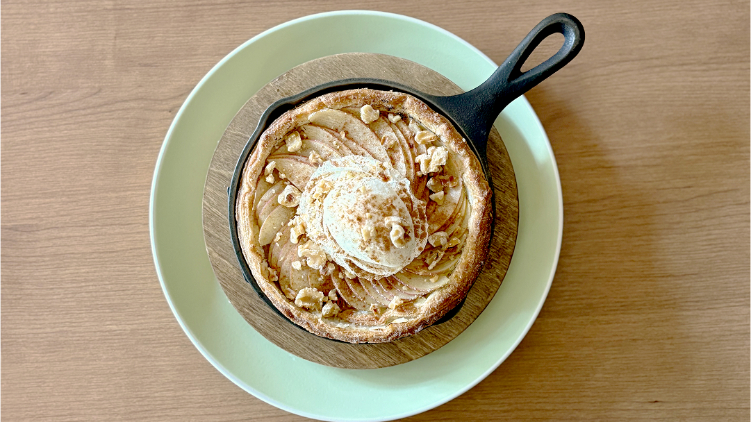 熱々スキレットで香ばしく焼き上げた特製りんごパイ。キャラメリゼしたタタンと瑞々しいスライス、赤ワインとブルーベリーの濃厚ソースをまとい、くるみとシナモンが香りを添えます。仕上げは信州小布施ジャージーミルクの濃厚アイス。りんごも赤ワインもブルーベリーも長野県産、地産地消の贅沢な一皿をぜひご堪能ください。