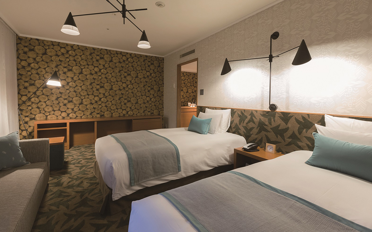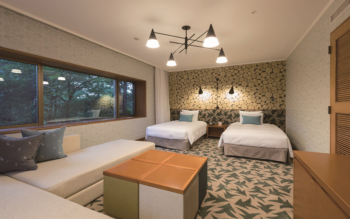 壁紙や絨毯に森をイメージした木々や葉のモチーフをとりいれ、穏やかな気持ちにさせてくれるくつろぎの空間。四季折々の美しい森と一体となり、思わず深呼吸したくなります。