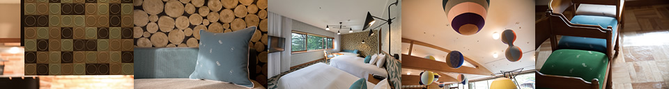 橋本夕紀夫氏がブランド「ミナ ペルホネン (minä perhonen)」のデザインによるパターンを壁紙や絨毯などのインテリアデザインにとり入れました。