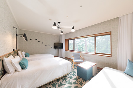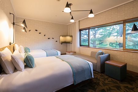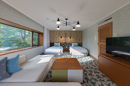 全客室の壁紙や絨毯に森をイメージした木々や葉のモチーフをとりいれ、穏やかな気持ちにさせてくれるくつろぎの空間。