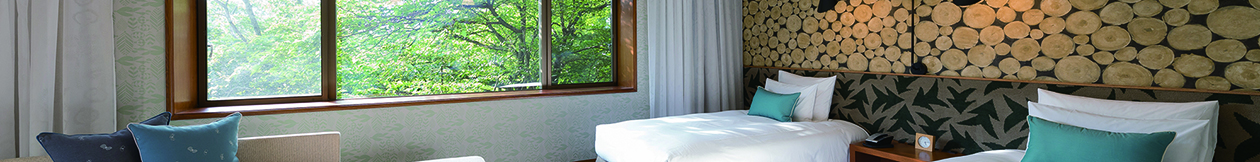 大きなピクチャーウインドウからは、四季の軽井沢の森を望む。ホテル イースト本館ご宿泊特典に加え、「スーペリアツインルーム」ご宿泊者限定サービスもご用意しております。