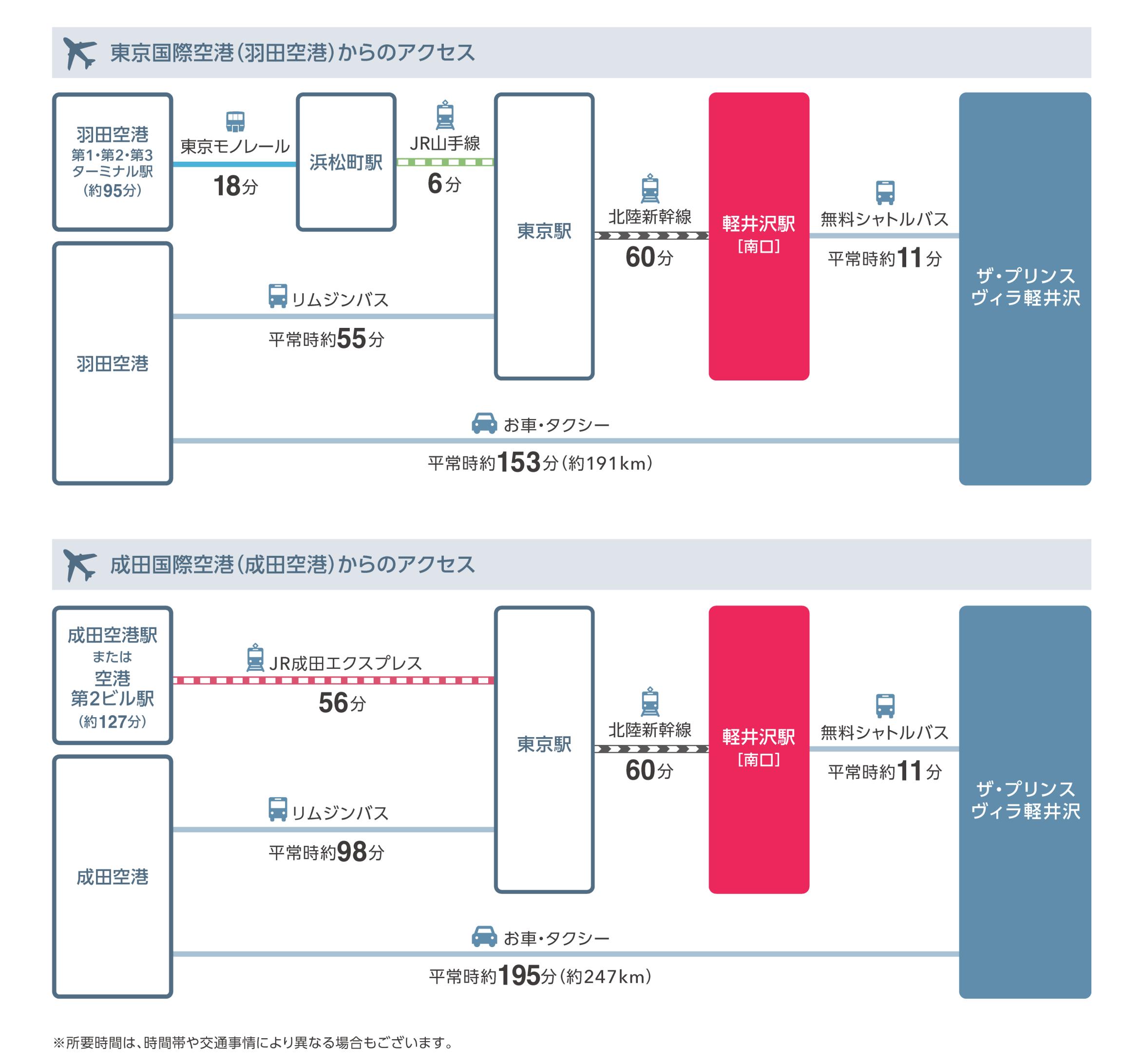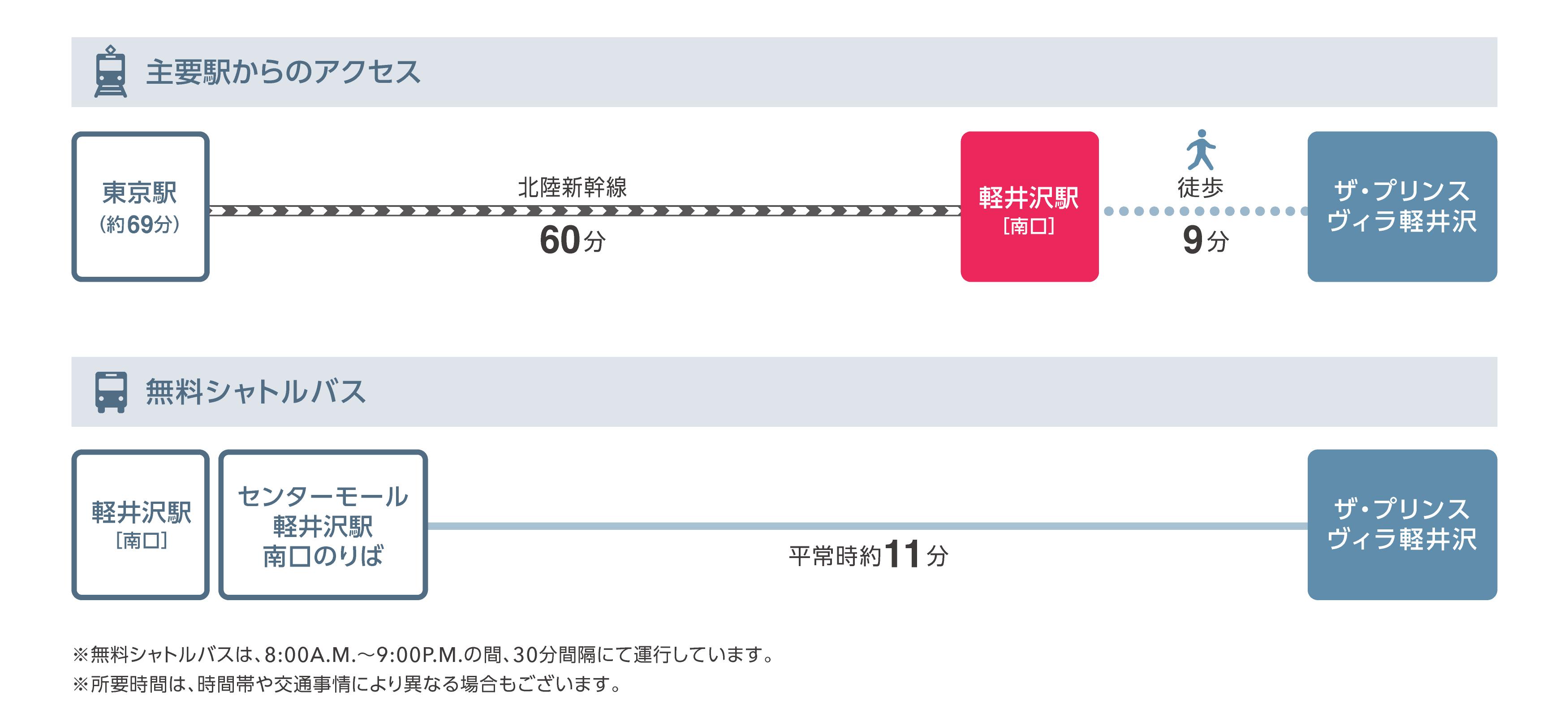 軽井沢駅南口より徒歩約9分、無料シャトルバス約11分軽井沢駅よりピックアップバスでホテルへ