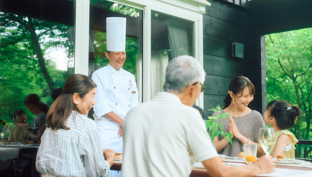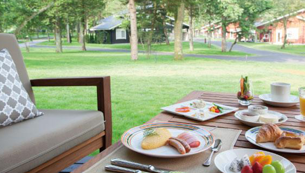 「センターハウスラウンジ」では、モーニング、ティータイム、サンセット&ナイトタイムと、時間帯に合わせた軽食や、アルコールを含むお飲みものが用意されています。新緑のさわやかな香りに包まれ、朝から優雅にスパークリングワインを楽しむなど、過ごし方は自由自在に気の向くままに。