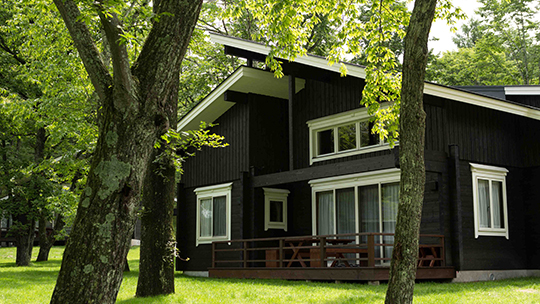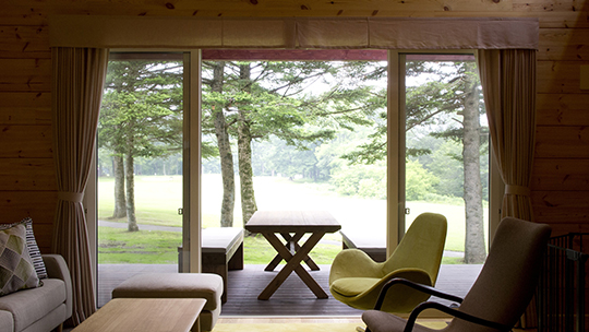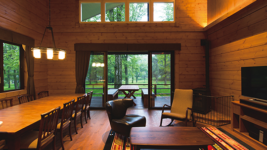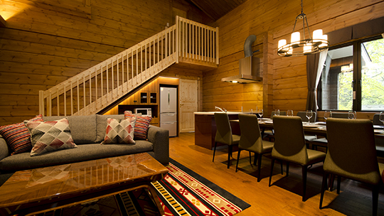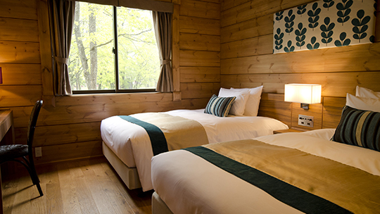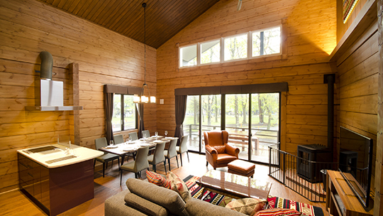 吹き抜けのリビングルームと2Fにもツインルームがあるメゾネットタイプ。ツインルームが3室あるので、3世代のご滞在でもゆったりお寛ぎいただけます。