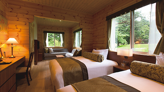 客室面積:102㎡、テラス(バルコニー)16.8㎡/定員:6名/ベッドサイズ:幅140cm×長さ200cm×高さ50cm 4台、幅96cm×長さ195cm×高さ55.5cm 2台
