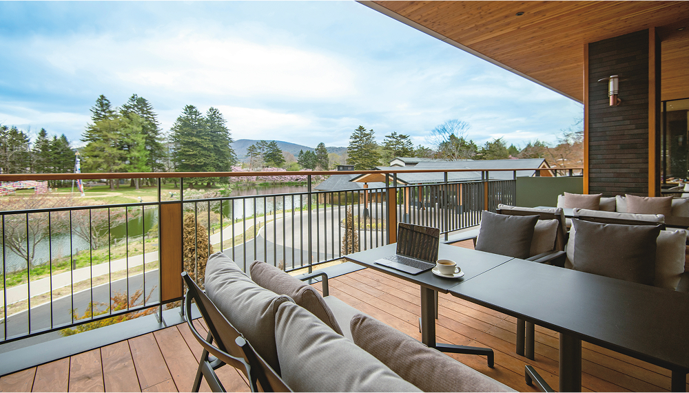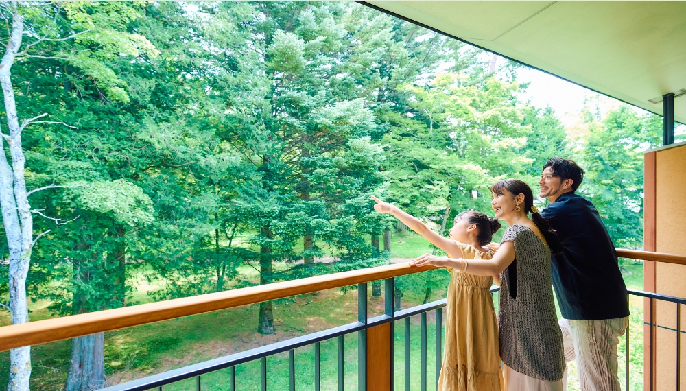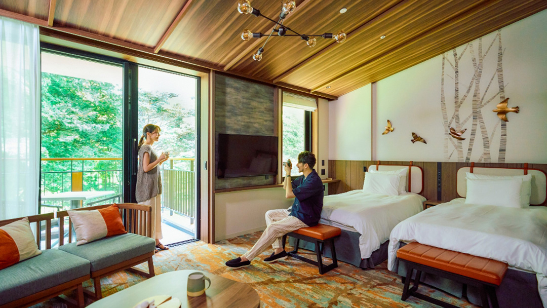 窓の外にはテラスがあり、室内にいながらも自然を感じられる客室。差し込む光で目を覚まし、朝のさわやかな空気を胸いっぱいに吸い込んだ後は、淹れたてのコーヒーを味わいながらリラックスタイム。多様なニーズに応える豊富なお部屋タイプで、ゆっくり過ごしたい3世代での旅行や、ワーケーション利用にも。