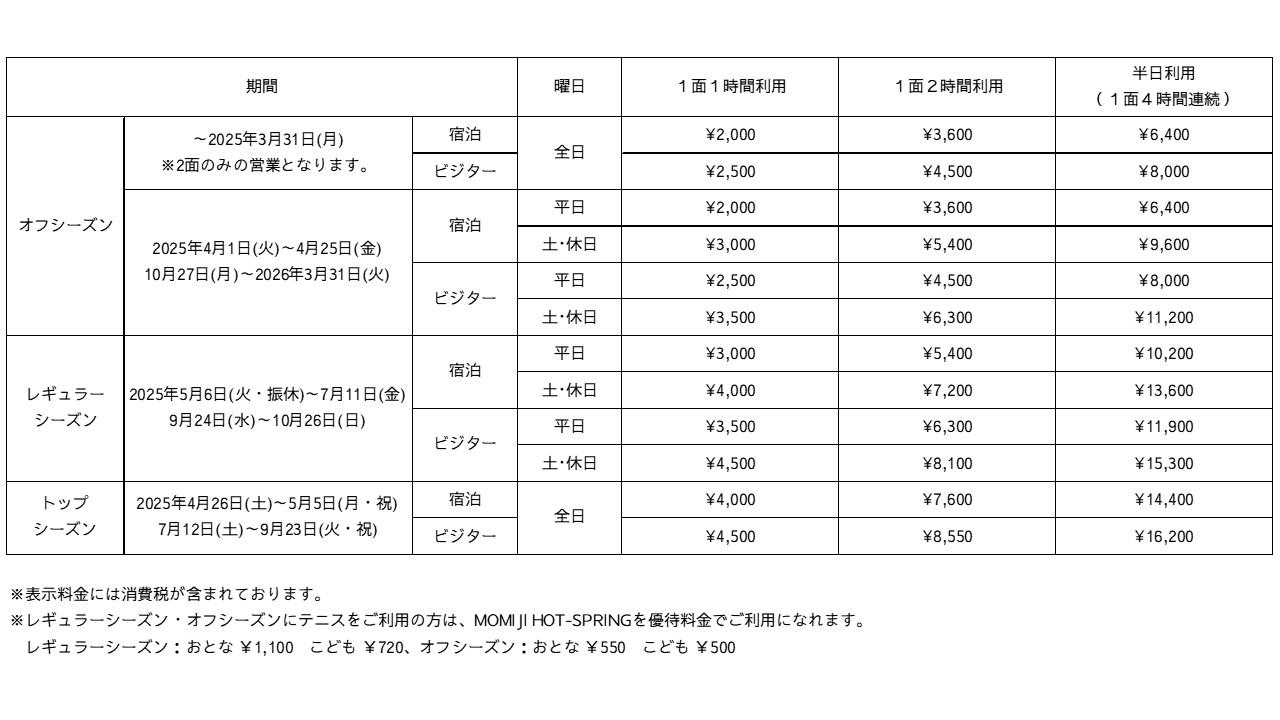 - その他:受付は「MOMIJI HOT-SPRING」で承ります。天候や状況によりご利用いただけない場合がございます。コートの状況は受付にお問合せください。