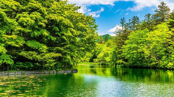 軽井沢のオアシスともいえる「雲場池」は四季折々の美しさで訪れるものを迎えてくれます。池の周りに設置された遊歩道を散策すると、そこかしこに美景スポットが。