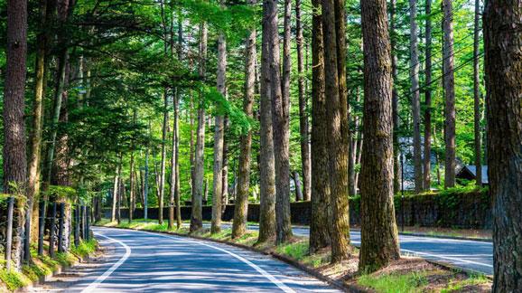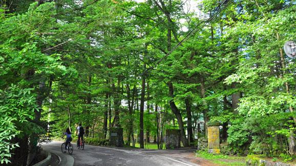 「三笠通り」は軽井沢のイメージをつくる景観・カラマツ並木が続く道路です。北に向かって走ると、中央分離帯が現れたエリアから森のような雰囲気になってきます。体力に合わせて走ってみましょう。