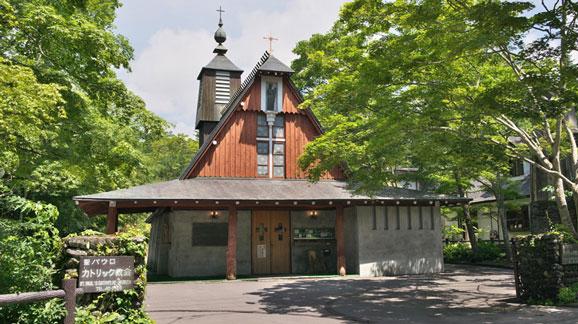 日本近代建築の父と言われるアメリカ人の建築家アントニン・レーモンドが設計したこの聖堂は、傾斜の強い三角屋根が特徴で、内部は丸太がむき出しとなっており、素朴で落ち着いた雰囲気をかもし出しています。また、著名人を含む多くの人がここで結婚式を挙げています。敷地内では、アシジの聖フランシスコ像やマリア地蔵、外壁の聖パウロ像などを見て回ることも可能です。