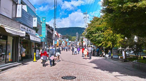 軽井沢のメインストリートといえば旧軽井沢銀座(旧軽井沢商店街)。オンシーズンには駐車場待ちも頻発しますが、自転車ならその心配もなく、気軽にいろいろなお店を訪ねられます。