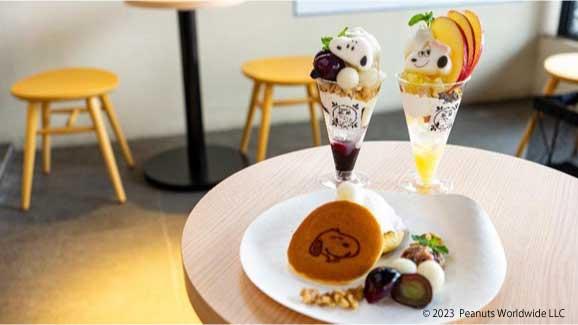 スヌーピーのデコがかわいい、信州の味覚を生かした「信州ミルクソフトとぶどうのあんみつパフェ」¥1,408や「あんバターどら焼きプレート」¥968がおすすめです。