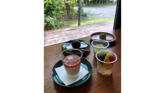 森の中に佇む瀟洒なショップのコンセプトは「森香るお菓子」。丁寧に作られた味わい深い菓子たちがサイクリングの疲れを癒やしてくれます。黒文字という木の香りを使ったプリンや通年販売のおはぎが人気。現在はテイクアウトのみの提供です。