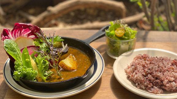 自慢のメニューは、「軽井沢産地野菜をじっくりと焼いた丸ごとトマトのスープカレー(サラダ、ドリンク付き)」¥1,830。オリジナルの野菜だしと20種類のスパイスをブレンドした深みのあるスープに、季節の高原野菜をたっぷり入れています。
