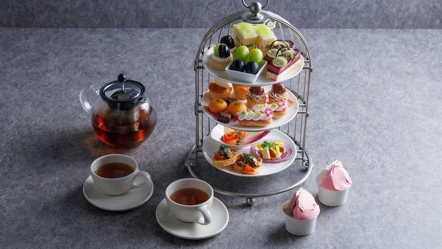 秋のフルーツ、栗や柿、シャインマスカット、ナガノパープルを使用したアフタヌーンティー。