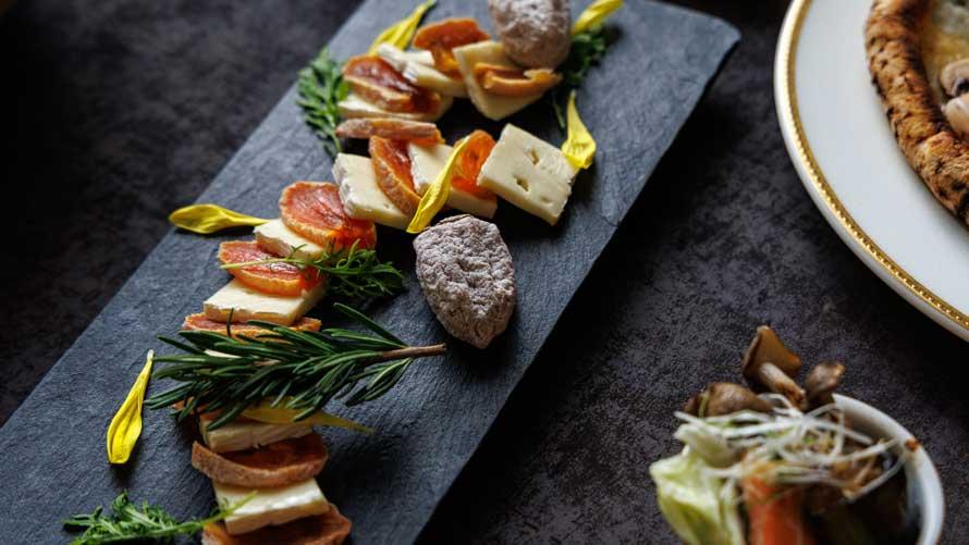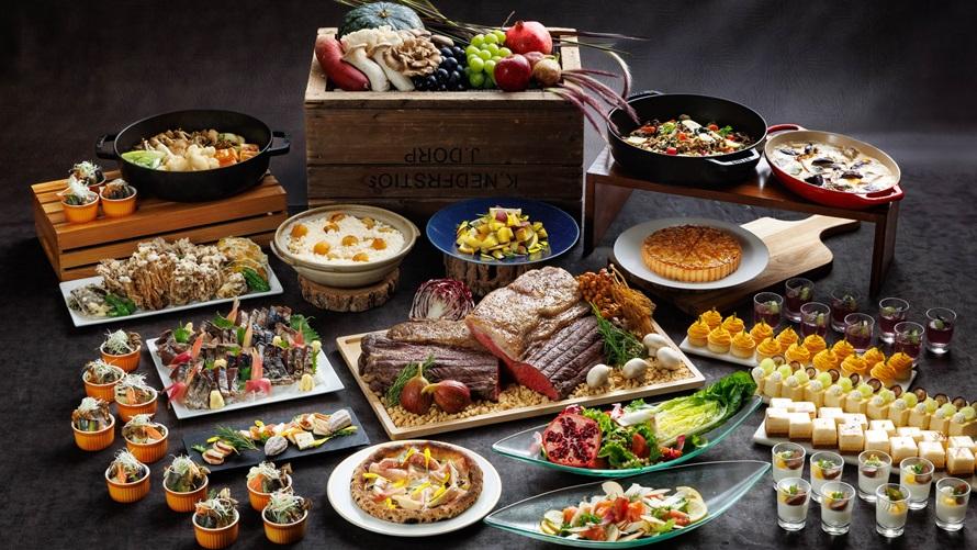 雲白肉(きのこ、秋の味覚)/さつまいものメープルレモンサラダ/クルミとニョッキのバターミルクサラダ/ざくろと野菜のマリネサラダ/ローストキノコとジャガイモの焦がしバター醤油/蒸し鶏とザーサイのレモンマリネ(キノコ入り)/チーズの盛り合わせ/パテ/柿とチーズのカプレーゼ/ブドウのジュレ/信州産ドライフルーツ/アスパラガスのグリル トリュフ風味ソース/白身魚のエスカベッシュゆず風味