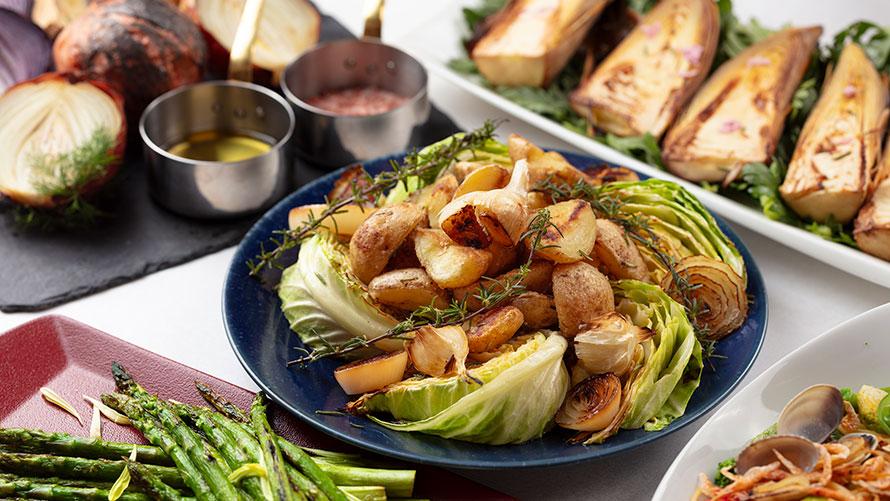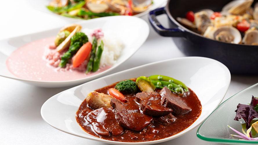 定番のローストビーフ、牛タン入りビーフシチュー、香ばしく焼き上げた春野菜のローストをはじめ、ちりめん山椒入り豆ごはん、飲茶各種、お寿司、若竹煮や蕗にしん煮など、やさしい余韻の和の味わいも揃いました。そして最後に、見た目のやさしさに反して、しっかりとしたコクが広がる「ピンクカレー」を。和・洋・中の魅力を一度に楽しめる、春ならではのバリエーション豊かなラインアップです。
