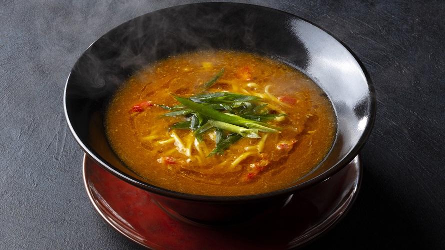 九条葱の緑が映える上海蟹の味噌と身を溶かし込んだ鮮やかな茜色のスープが主役