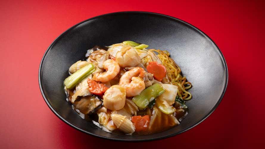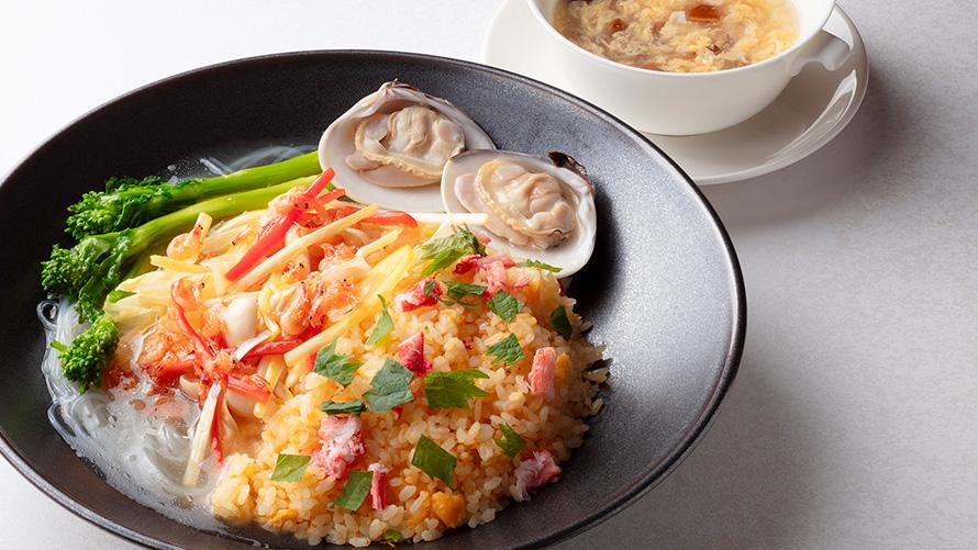 大葉が爽やかに香る紅ズワイ蟹入りチャーハンに、彩り豊かな野菜を合わせた塩味あんをたっぷりと。蛤と桜海老の旨味を閉じ込めたあんが、春雨の心地よい食感とともに広がります。