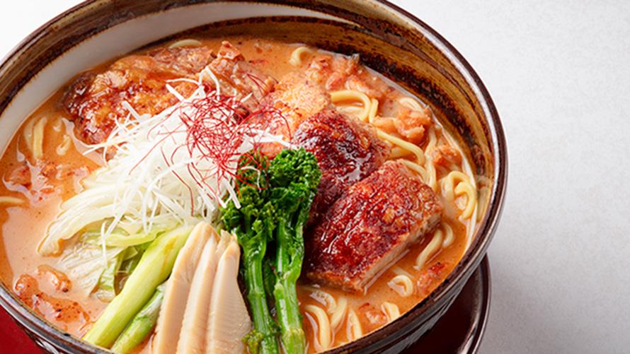定番の担々麵に排骨を組み合わせたボリューム麺。桜海老を散りばめた胡麻担々スープに、カレー風味の衣で揚げた信州米豚ロースに菜の花、筍を添えた春だけの担々麵。