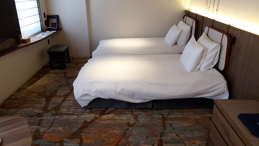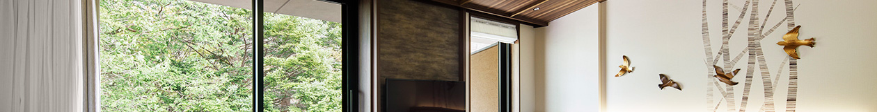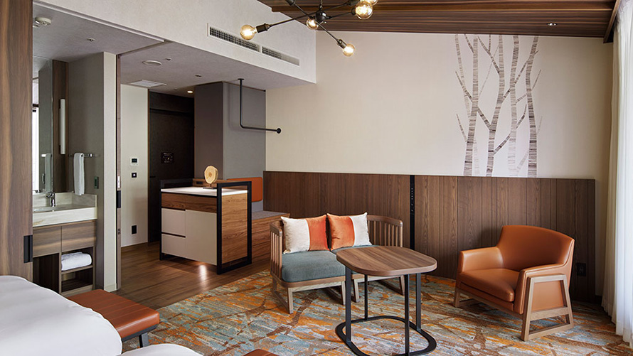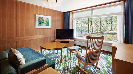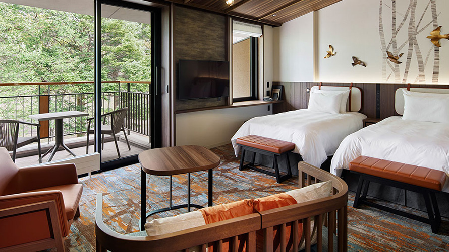 自然とのつながりを感じられるツインルーム。窓の外にはテラスがあり、お部屋にいながらも軽井沢の自然を満喫いただけます。トランドルベッドのご利用で最大4名さまのご滞在や一部コネクティングルームとしてご利用でき、お部屋でゆっくり過ごしたい3世代旅行やワーケーション利用に最適です。
