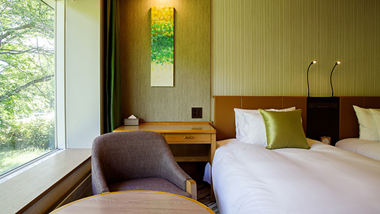 お部屋の窓からは、軽井沢の四季の庭園を望むツインルーム。観光、ショッピング、ゴルフ、スキー、テニス、MICEなど、多目的にご利用いただけます。ソファーベッドのご利用で最大3名さままで滞在可能です。