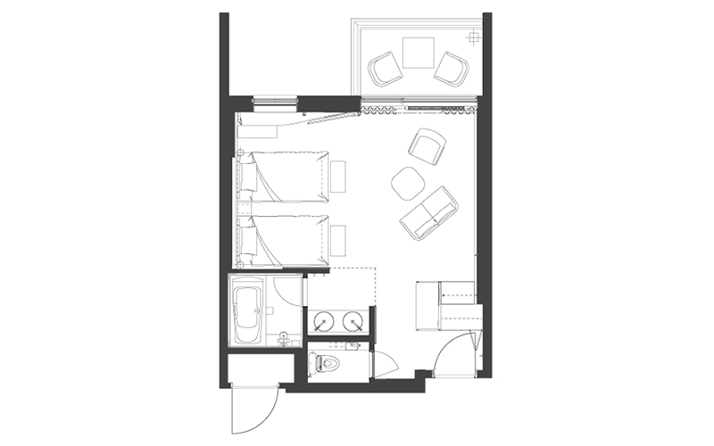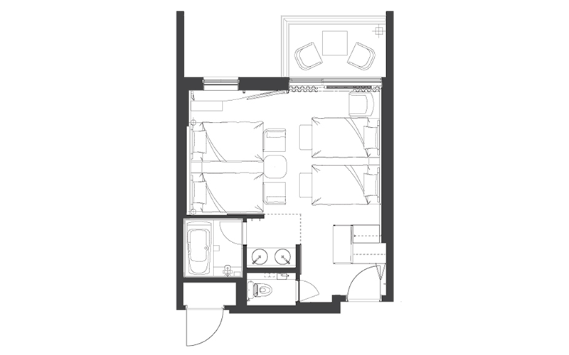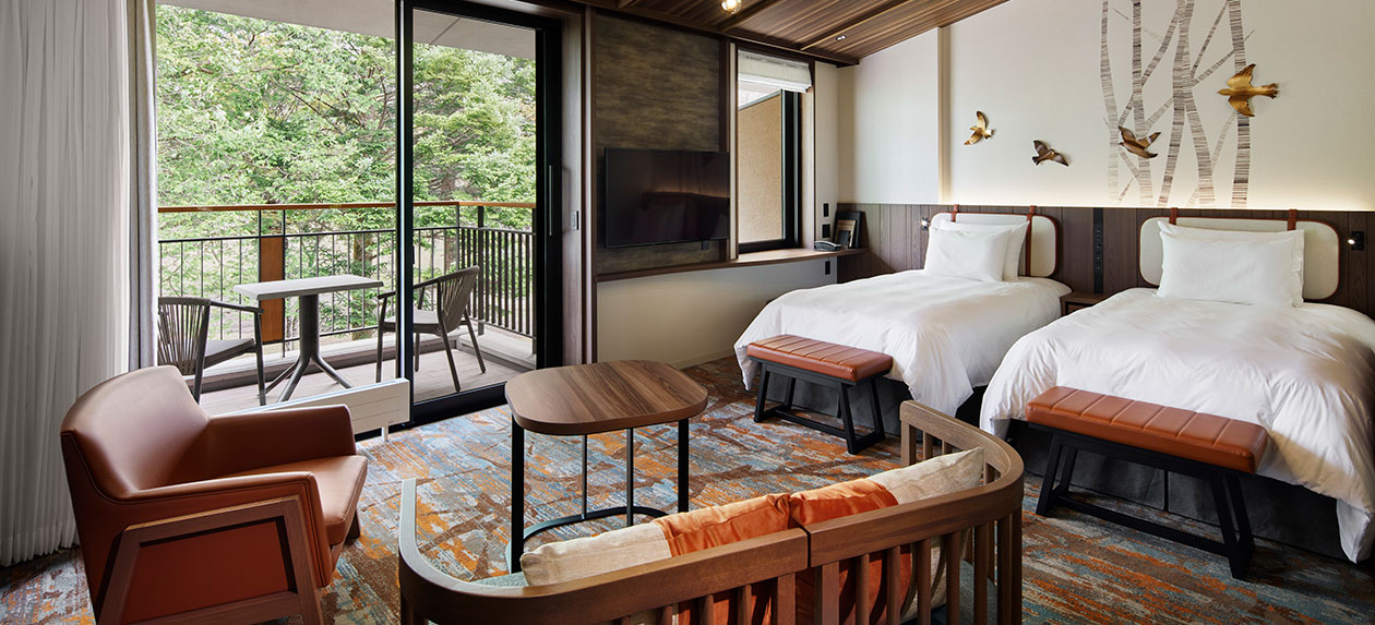 自然とのつながりを感じられるツインルーム。窓の外にはテラスがあり、お部屋にいながらも軽井沢の自然を満喫いただけます。