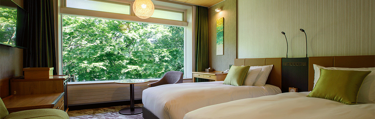 お部屋の窓からは、軽井沢の四季の庭園を望むツインルーム。