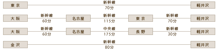 ・軽井沢駅から車で2km(平常時3分)、碓氷軽井沢I.C.から車で11km(平常時17分)