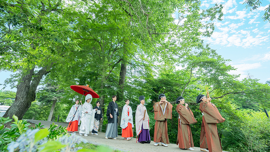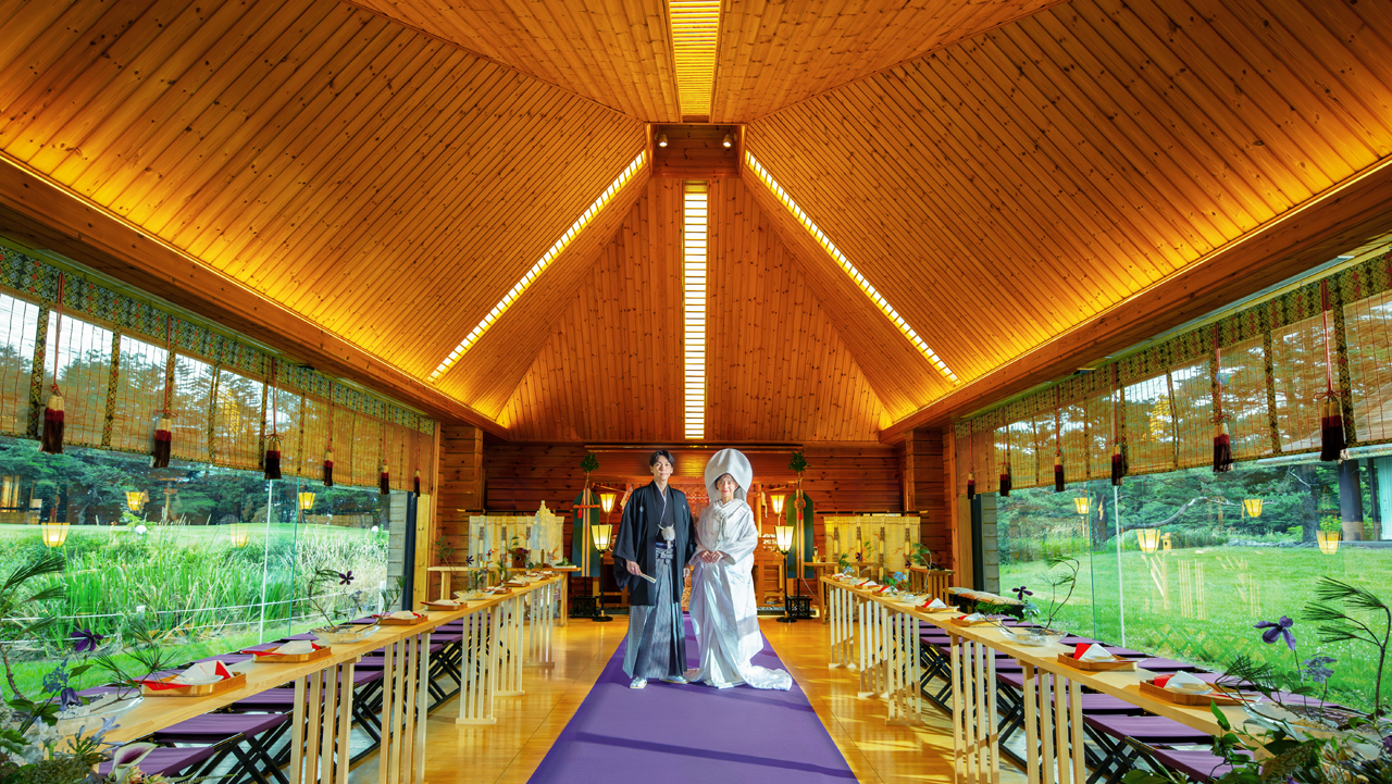 熊野皇大神社別宮として祀られる「もみの木神殿」は四季折々の自然を眺めながら挙式が叶います。