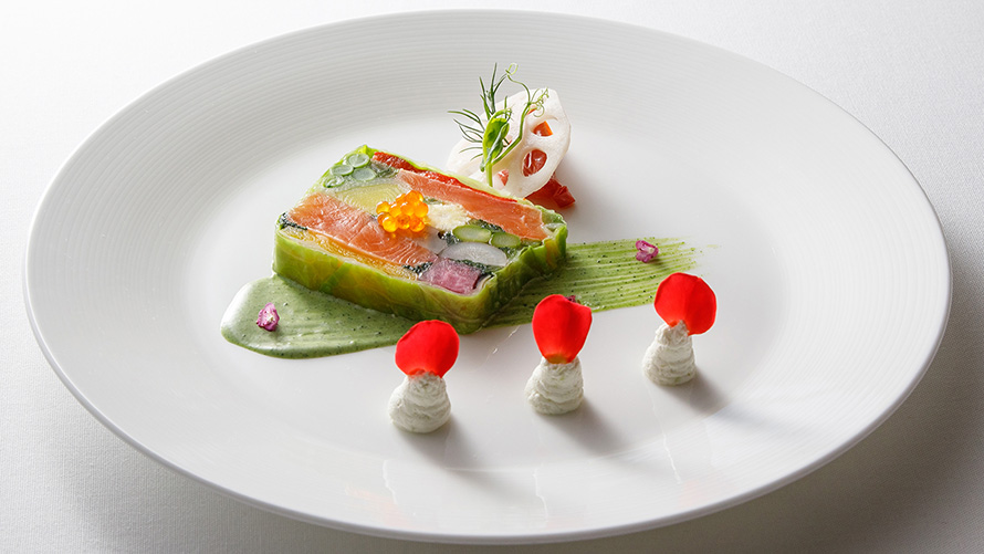 トラウトサーモン 野沢菜 彩り野菜のモザイク仕立て わさびクリームのアクセント
