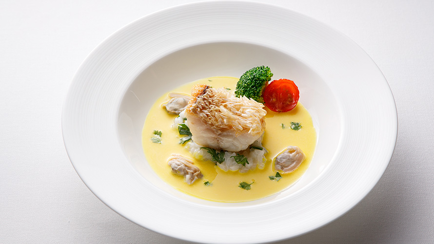 甘鯛のクリスティアン サフラン香るアサリのジュと春菊のリゾット