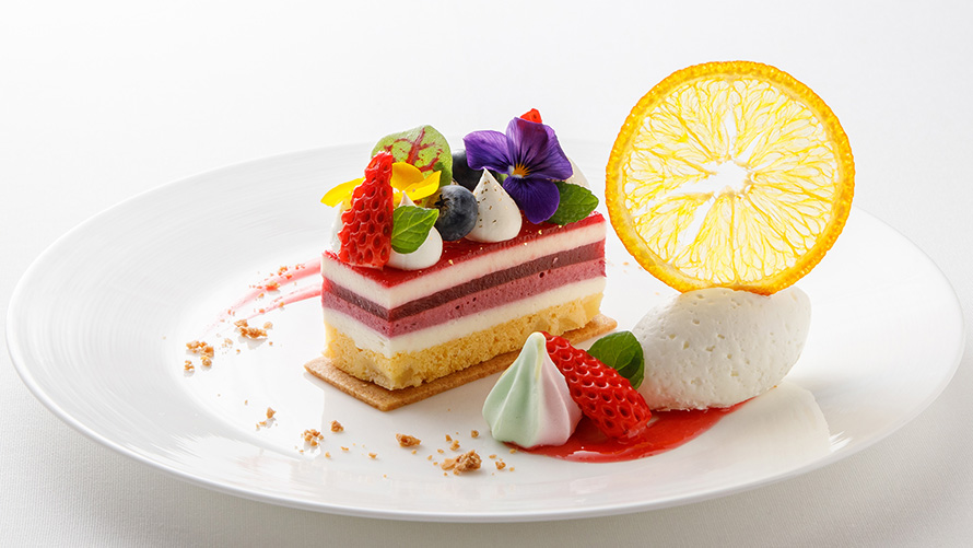 赤い虹に見立てた4種のベリーのムースケーキ 信州八ヶ岳高原のヨーグルト アイスクリームを添えて