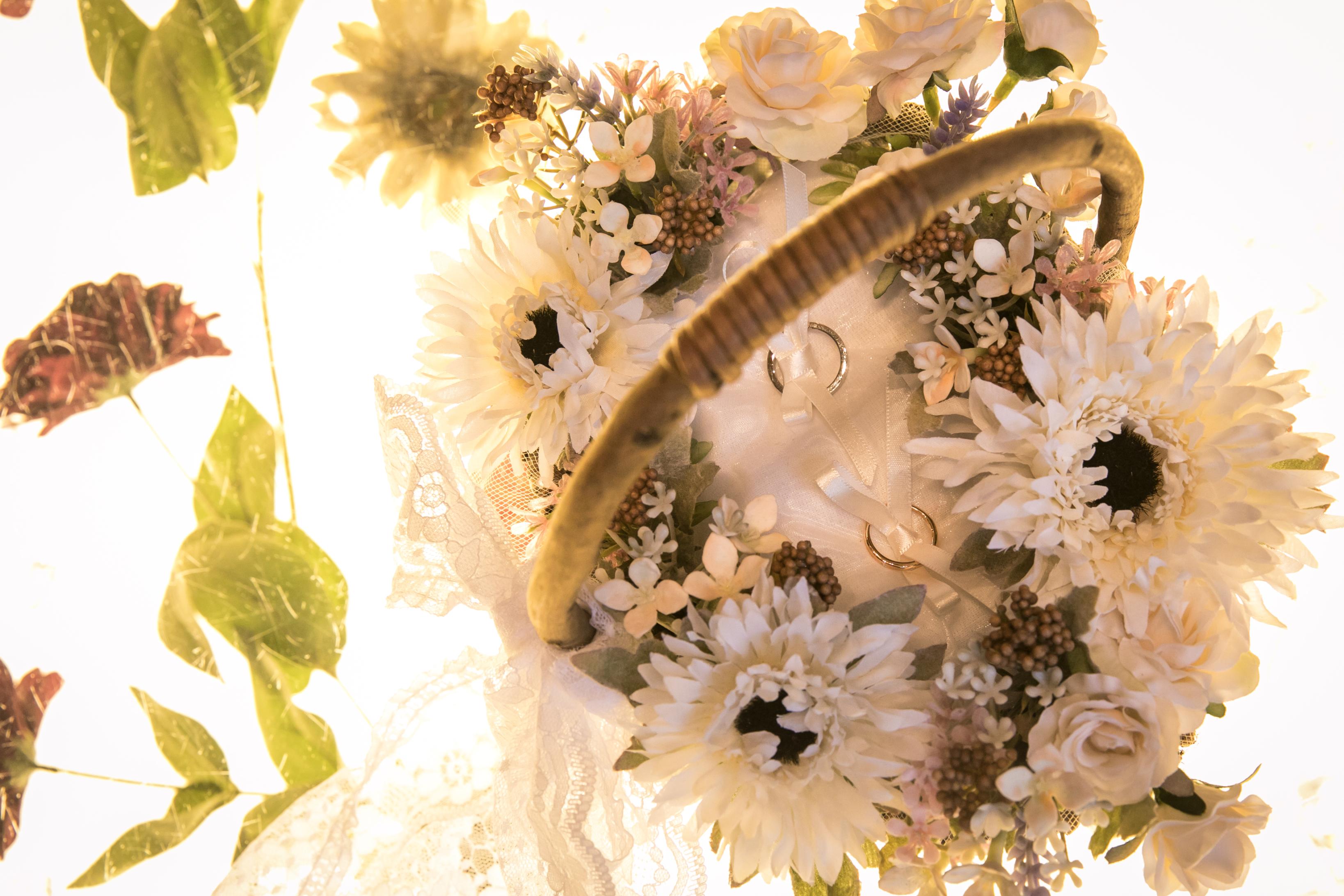 ブーケやヘッドフラワーも秋の色味をくすみ系のカラーで統一して全体的にふんわり優しい印象に。