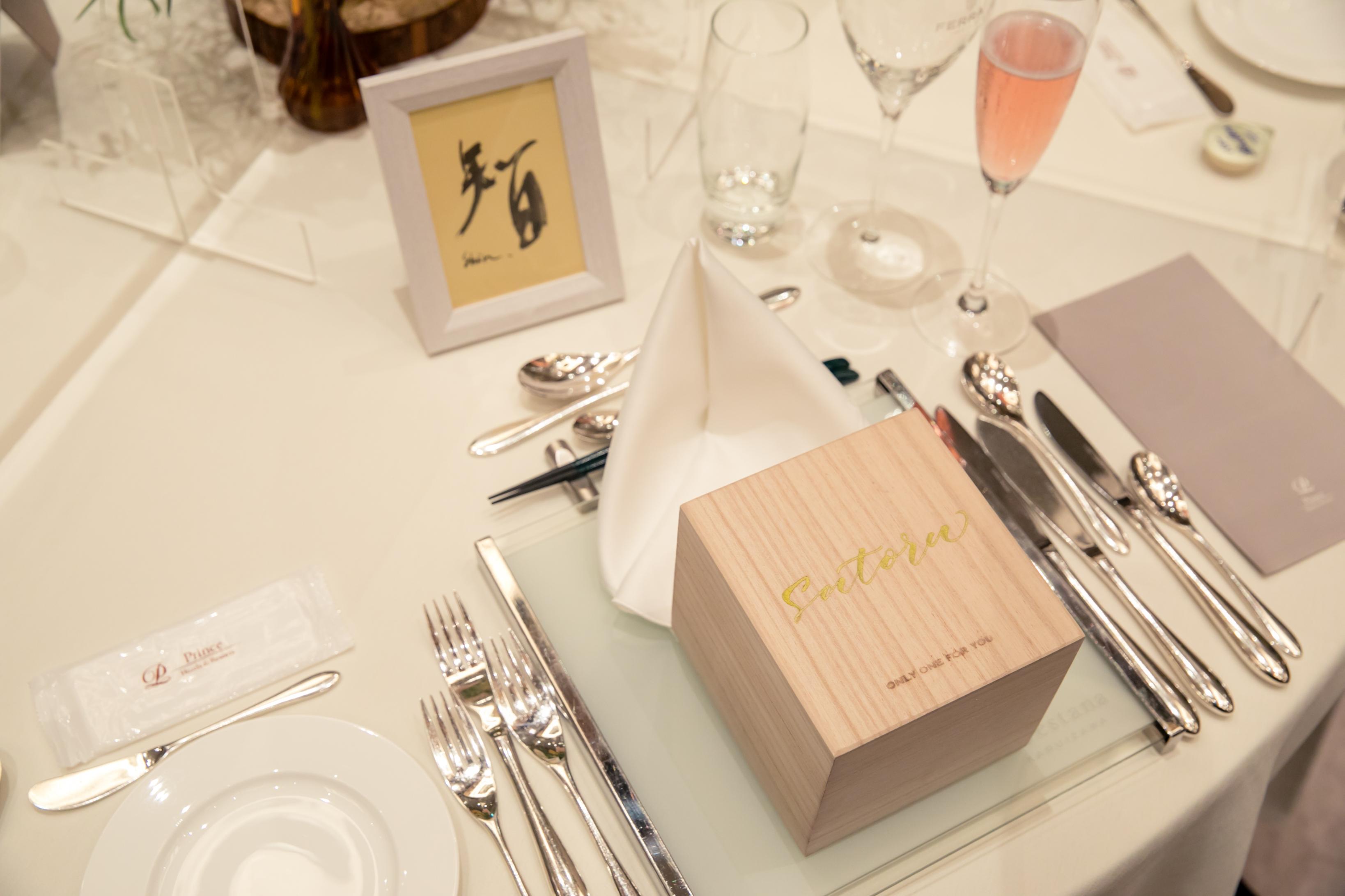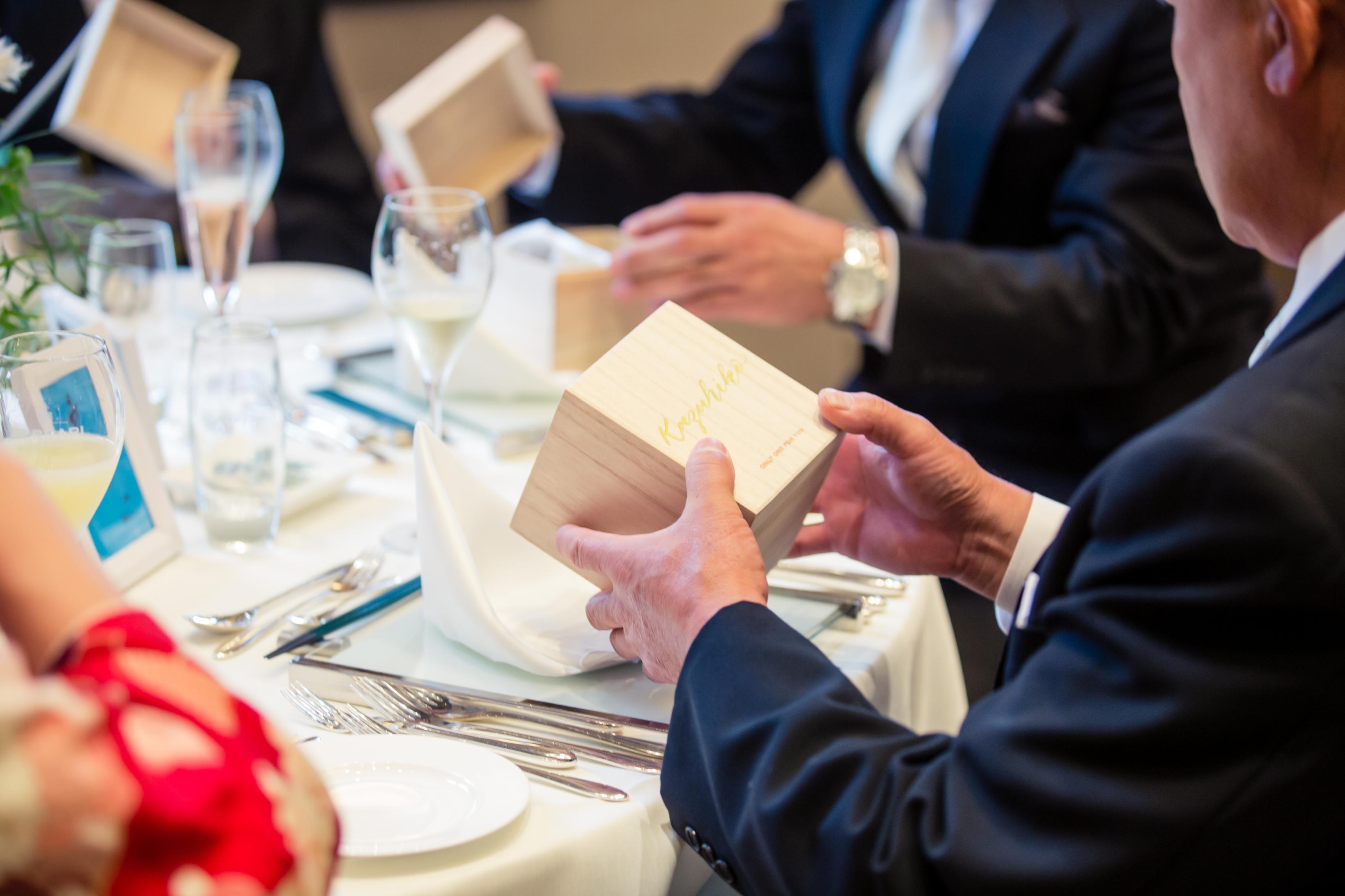 パーティー会場にゲストが着席すると、ひとりひとりの席に木箱のギフトボックスが。