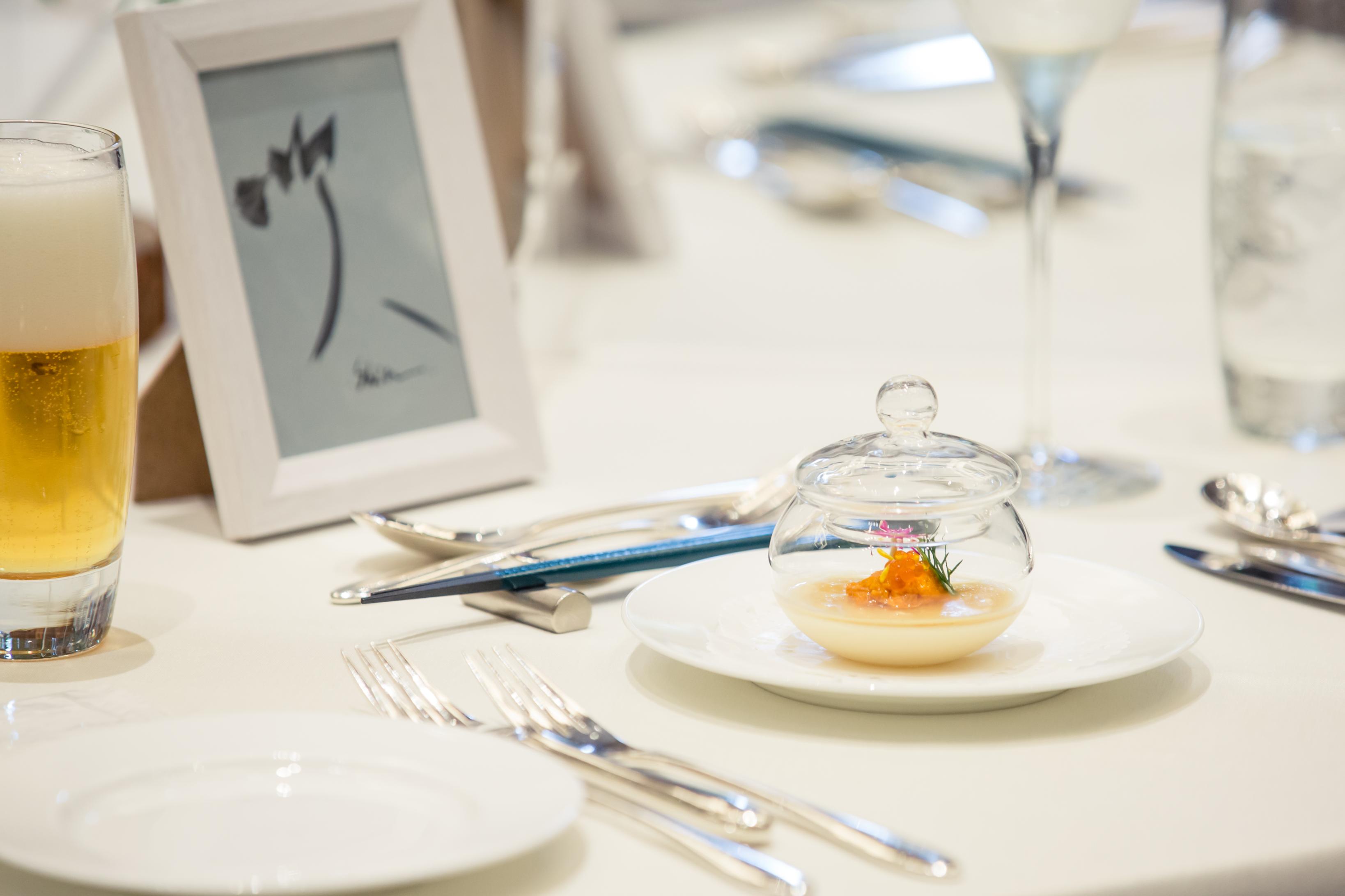 披露宴の料理は、ザ・プリンス 軽井沢のフレンチレストラン「ダイニングルーム ボーセジュール」の濱野料理長を指名し、私たちだけのスペシャルメニューを作っていただきました。