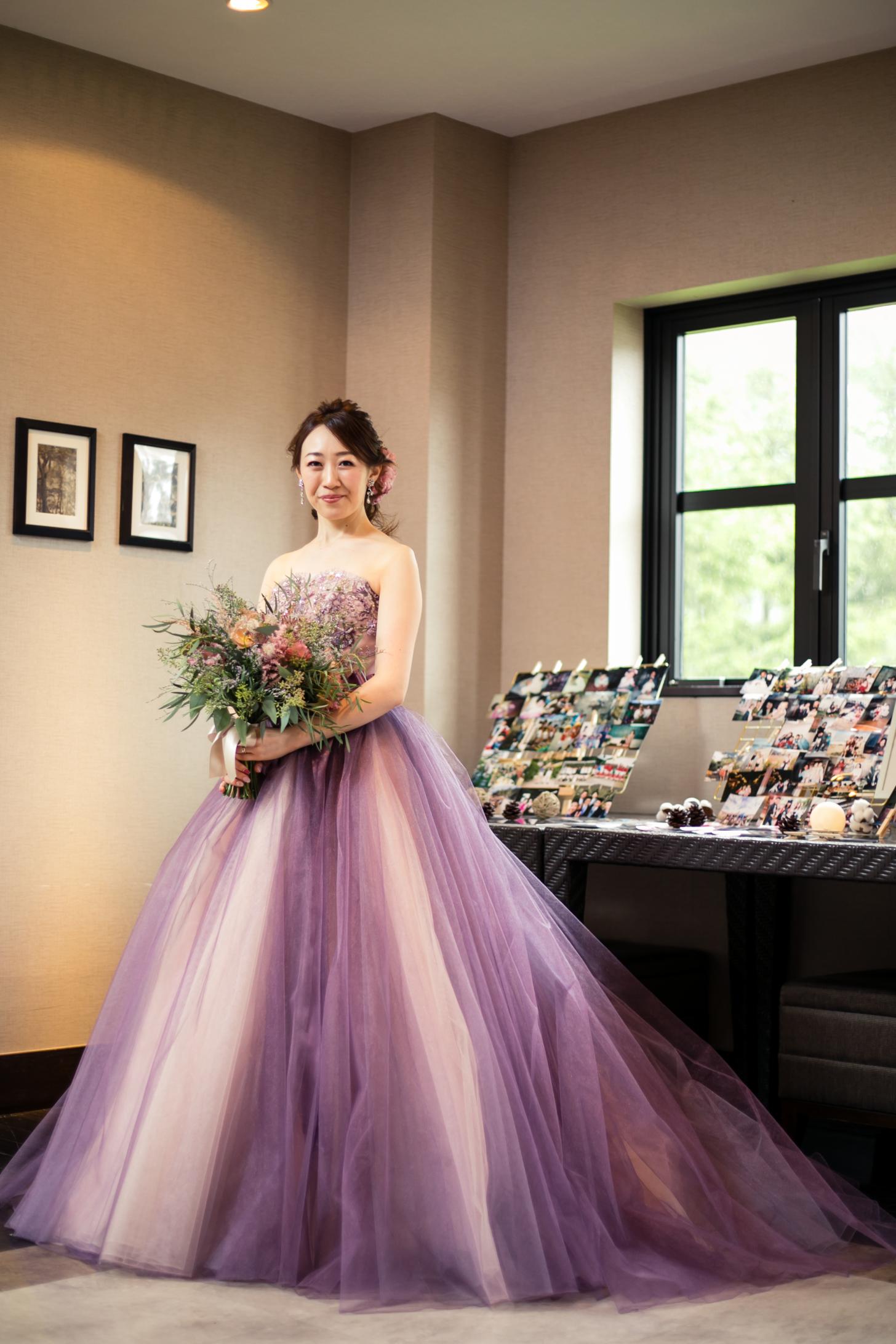 また、お色直しのカラードレスも秋らしい淡いパープルとピンクのグラデーションがきれいな色味のドレスをチョイス。