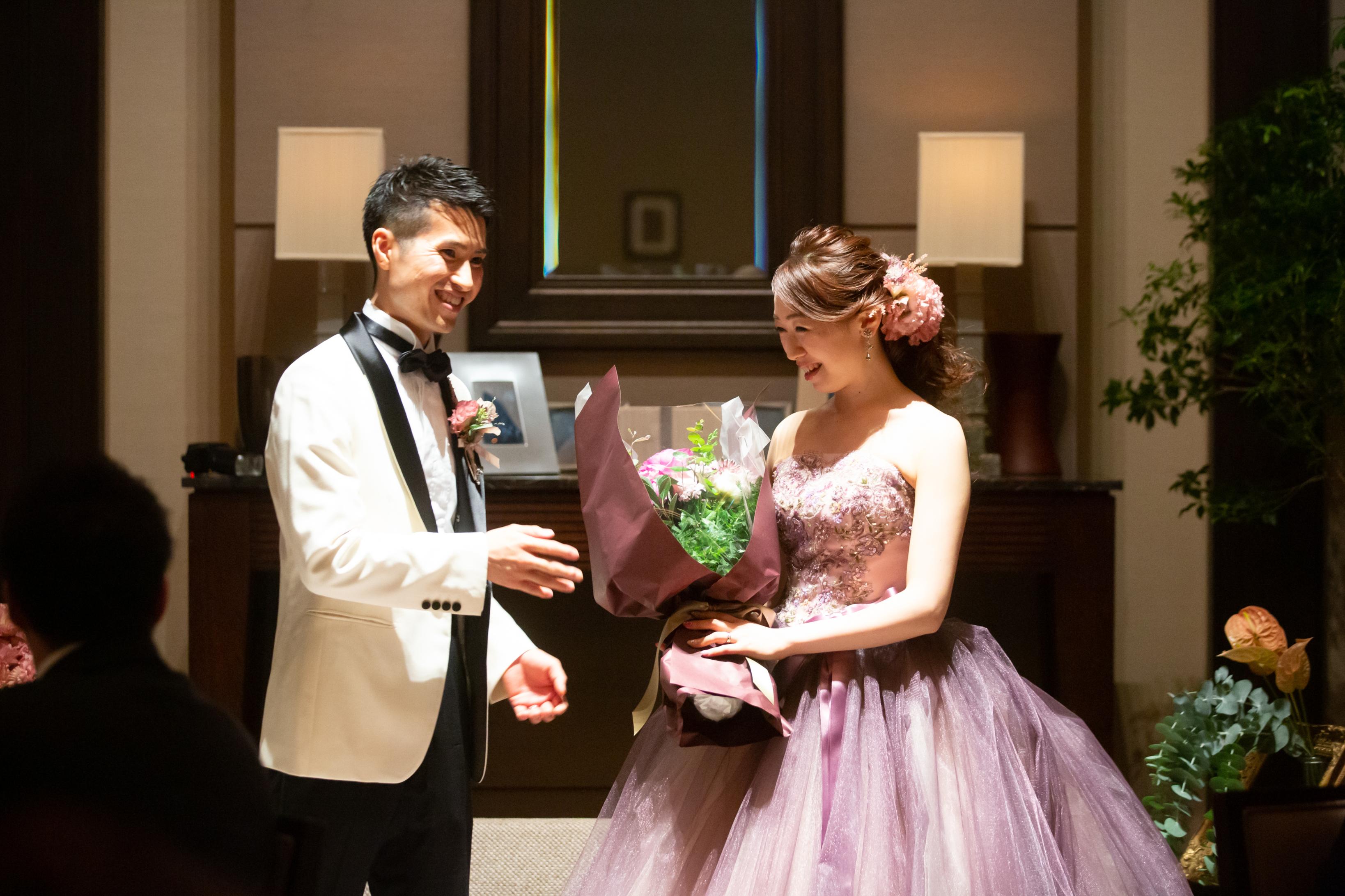 新郎さまからのサプライズの花束のプレゼントや、プロポーズの日を記録した映像を流すなどふたりが互いを想い合う演出に会場内も温かな気持ちに包まれました。
