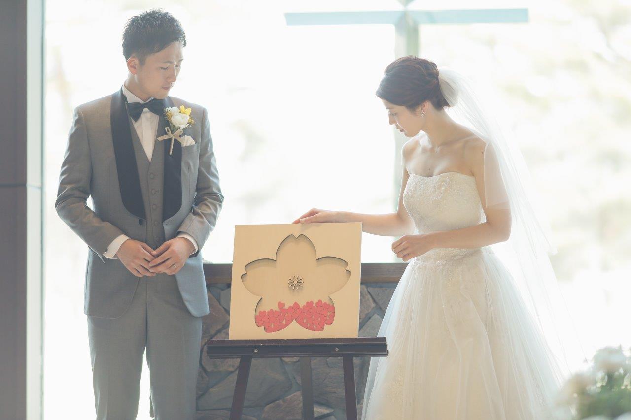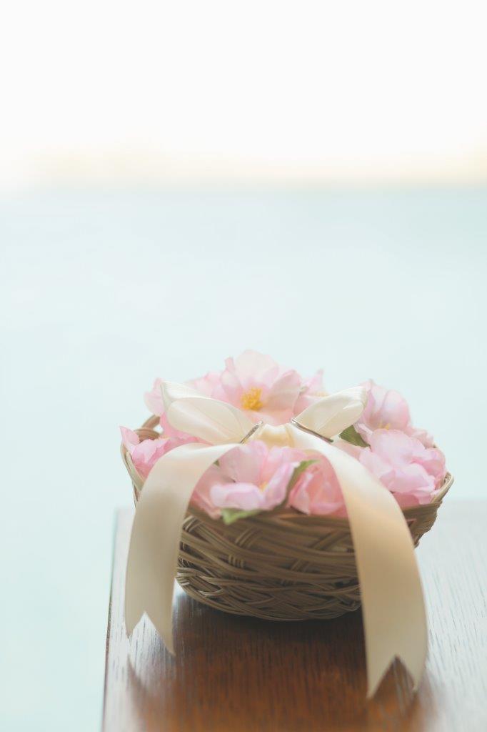 ・挙式は2人の思い出の桜を取り入れるためにドロップスやリングピロー、フラワーシャワーなど小物には