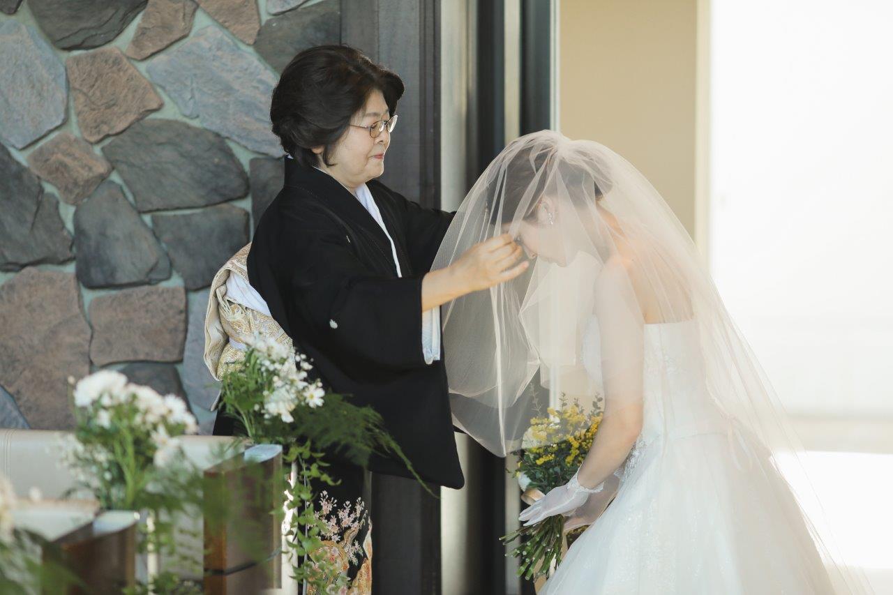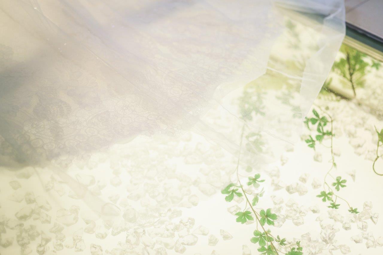 ウェディングドレスはチャペルで映えるようにサテンではなく透明感の出るレース生地のもので、
