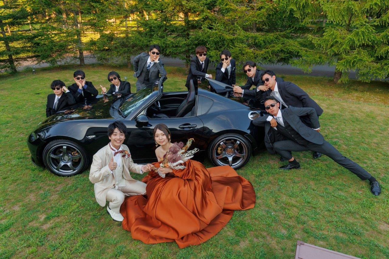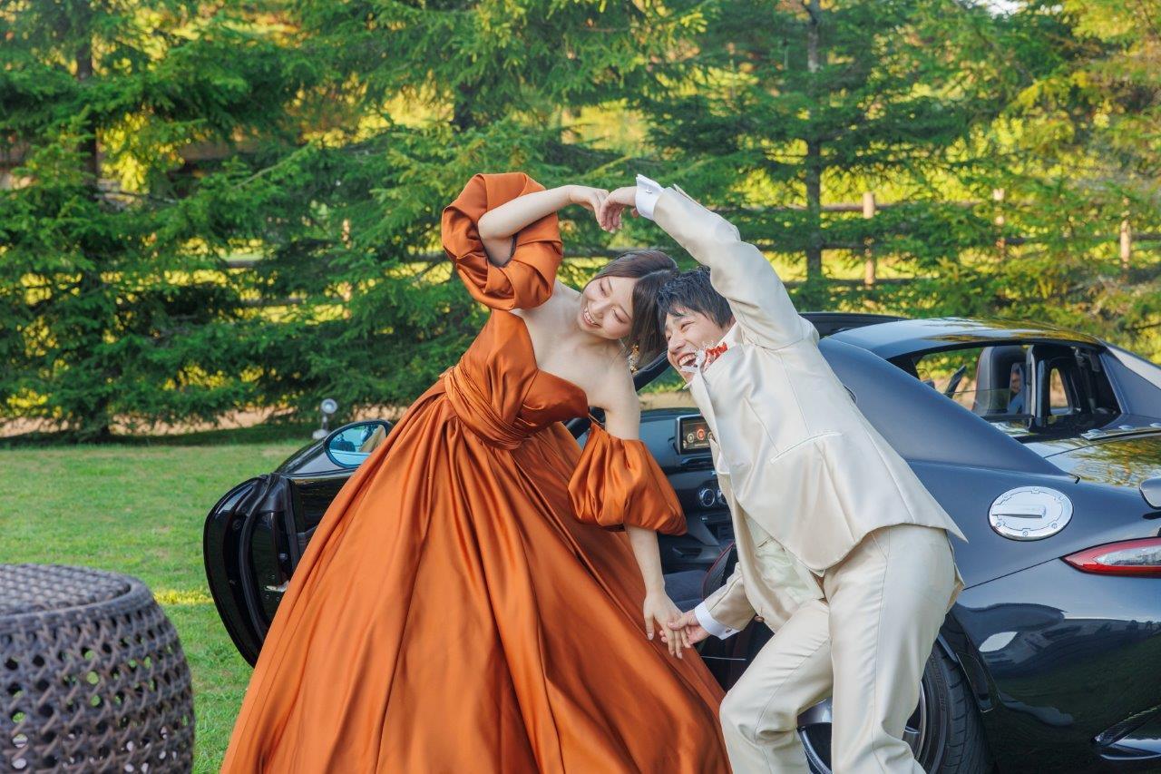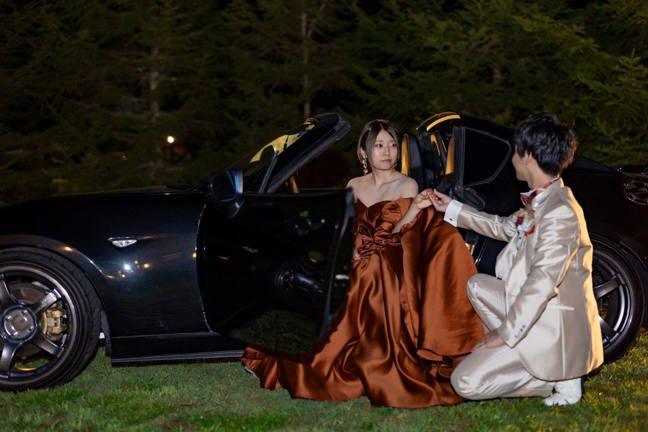お色直しの入場シーンでは、ゲストへサプライズするため正規入場口はフェイクとし、ガーデンからオープンカーで入場しました。車は友人に押してもらいゲストと共に作り上げた最高のサプライズになりました!車から降りた後はふたりでポーズも決めました!