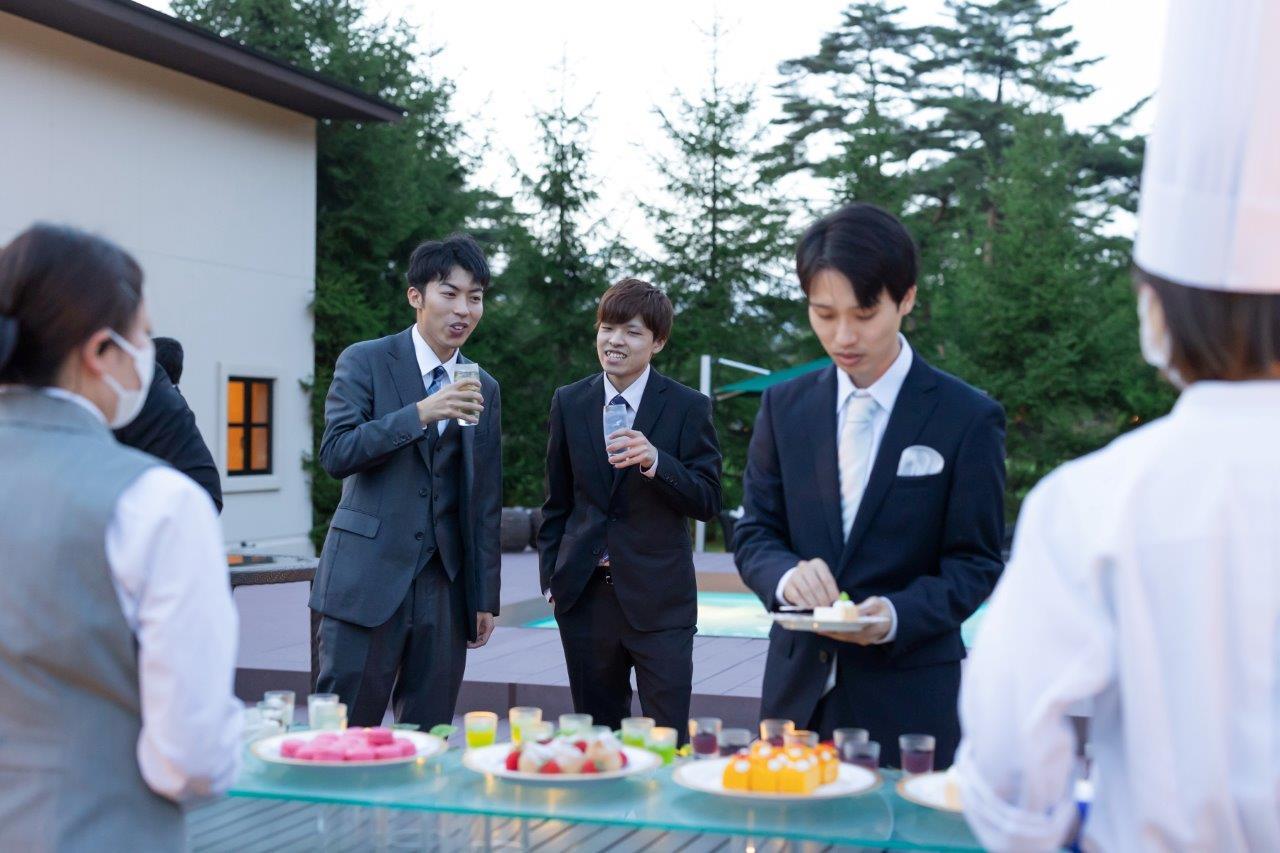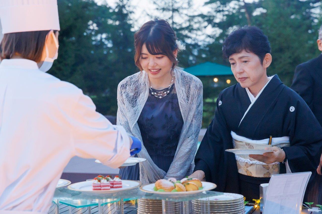 ガーデンでデザートブッフェを設置して、ゲストが自由に移動できる時間を作り、堅苦しくないようにしました。