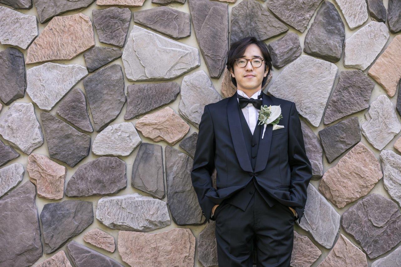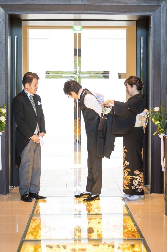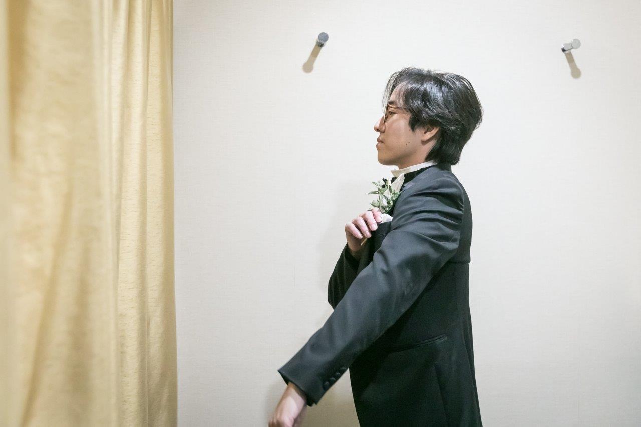 お色直しで着用したブラウンのタキシードはドレスとの相性も良く、かっちりしすぎないようにワイシャツをあえてデニムシャツにし、靴下もドレスとリンクさせるためにテラコッタカラーにしました。