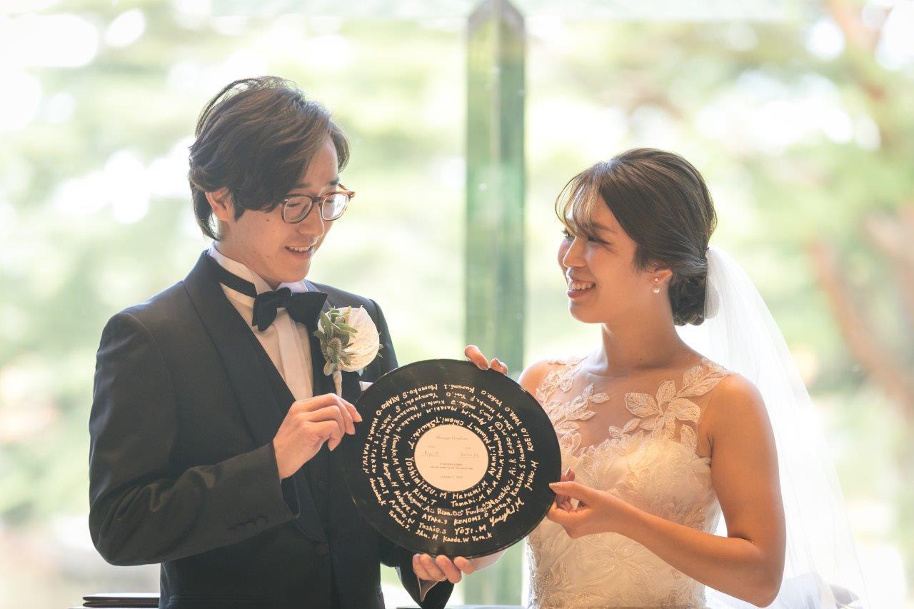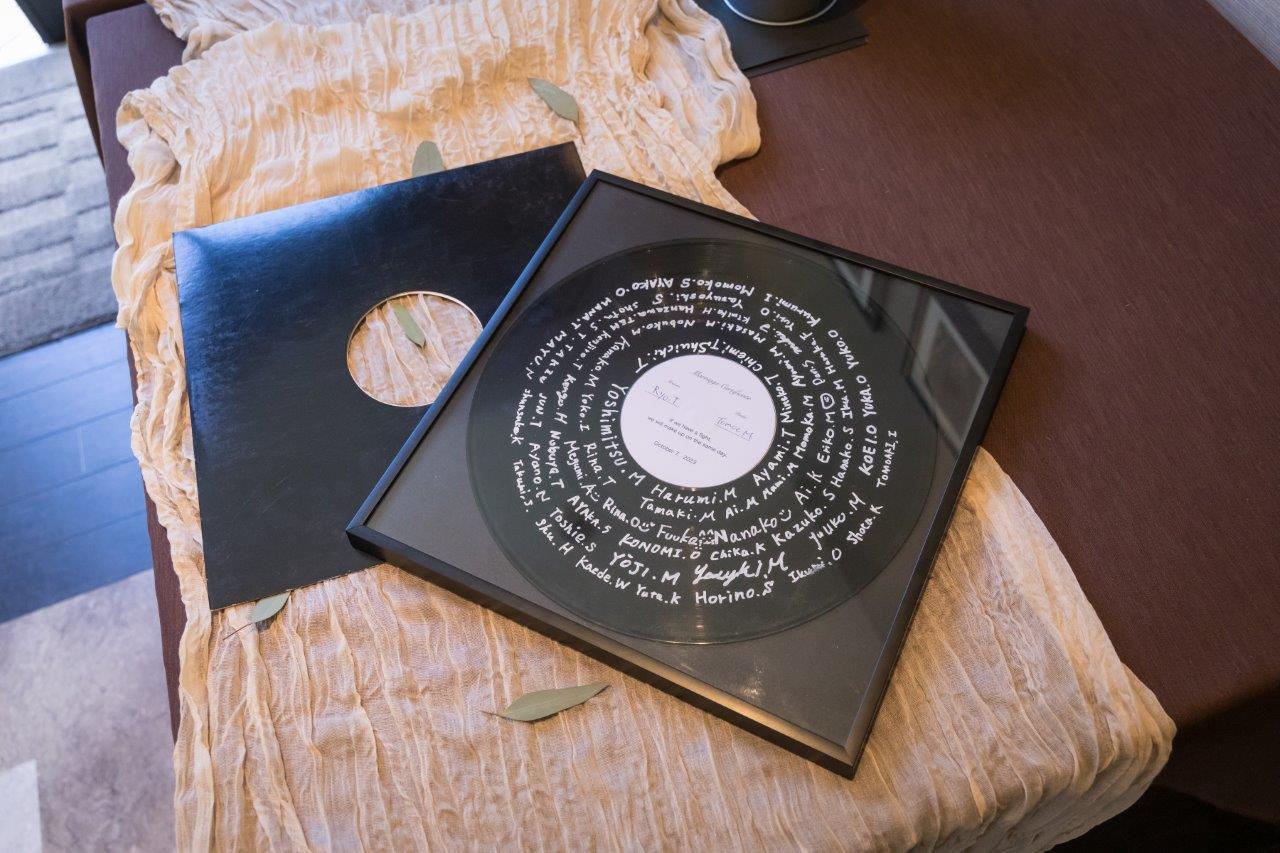 よく自宅で聴くレコードにゲストのみんなからサインをしてもらって結婚証明書としました。