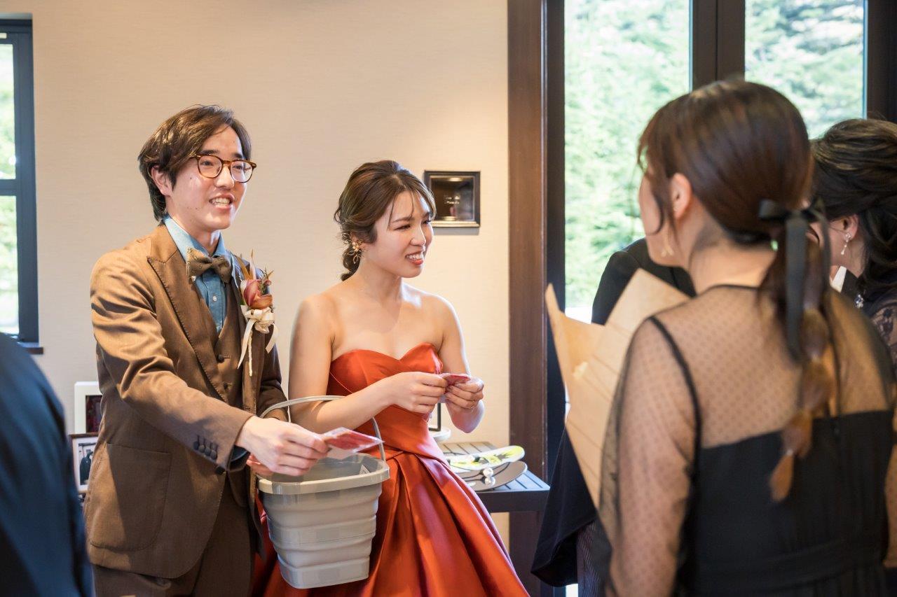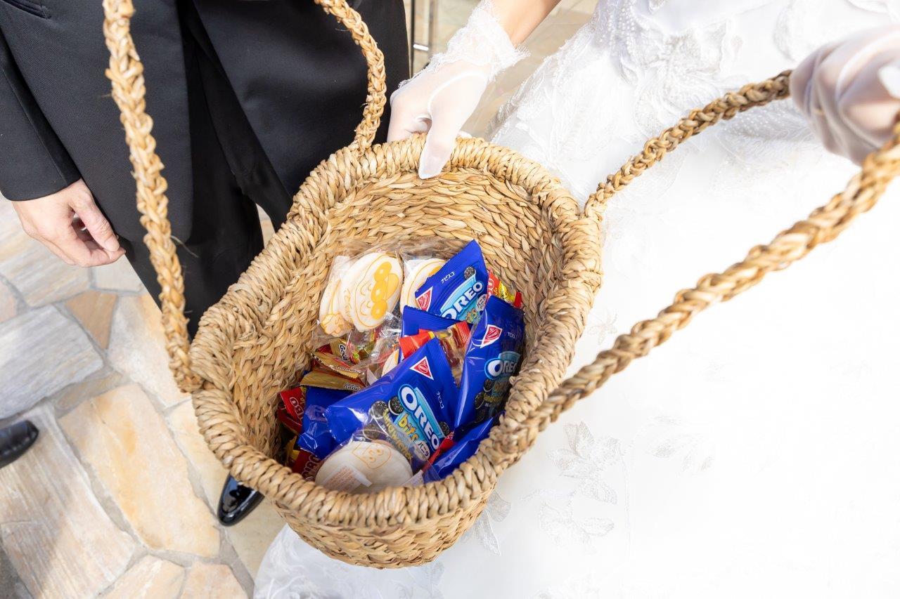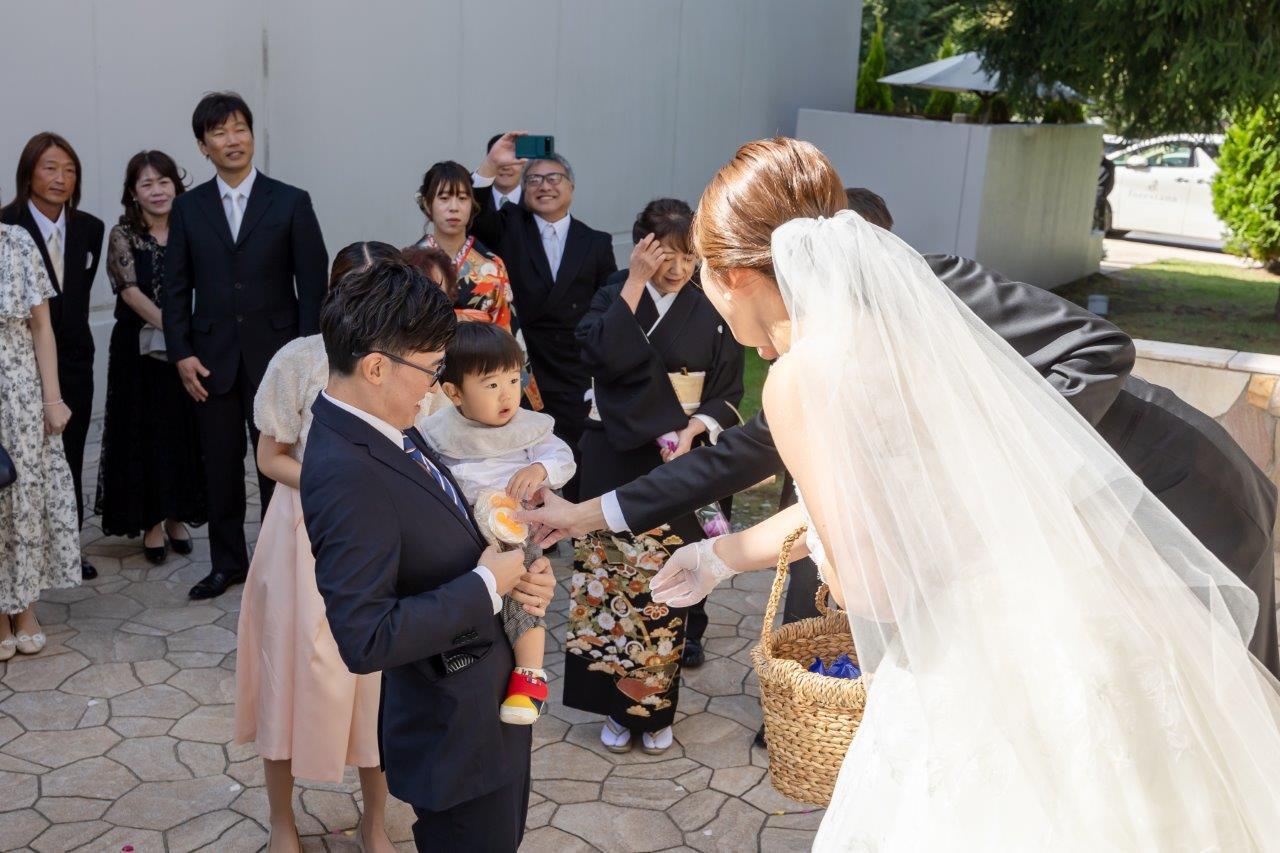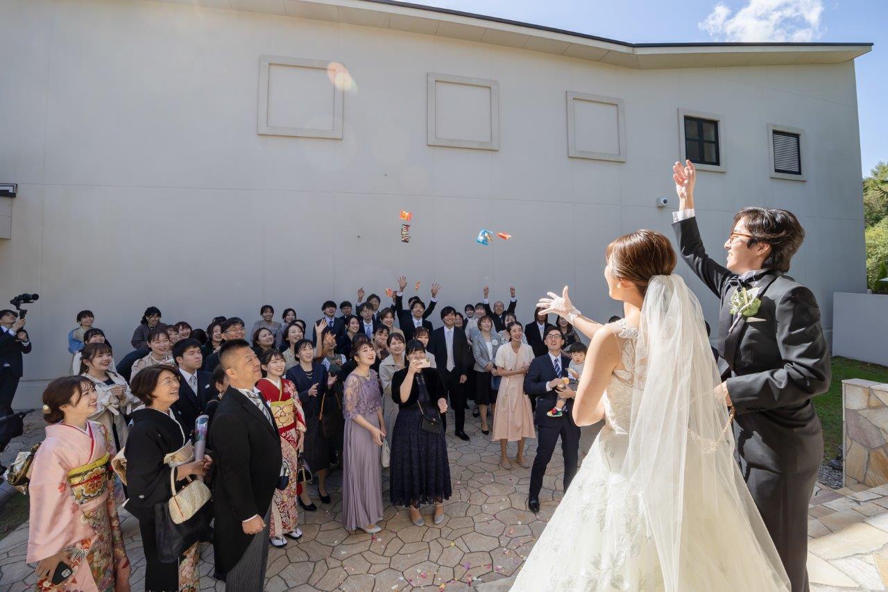 ブーケトスの代わりにゲスト全員が参加できるお菓子まきを行いました。