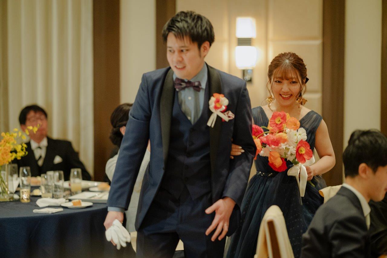 あまり人と被らないドレスがいいなと思っていて、時期も2月だったので寒さにも耐えられるように袖付きのドレスを選びました。カラードレスはテーマカラーのネイビーブルー。意外とみんなの予想通りの色だったようです。
