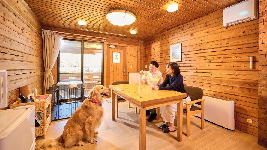 軽井沢の自然の中に点在するワンちゃんと一緒に滞在できるログコテージ。テラスにはリードフックを付けるなどワンちゃんとの楽しい滞在を実現するために室内外にさまざまな装備をご用意しています。