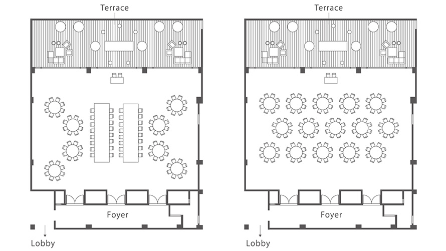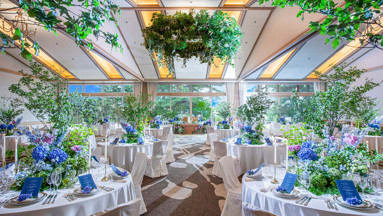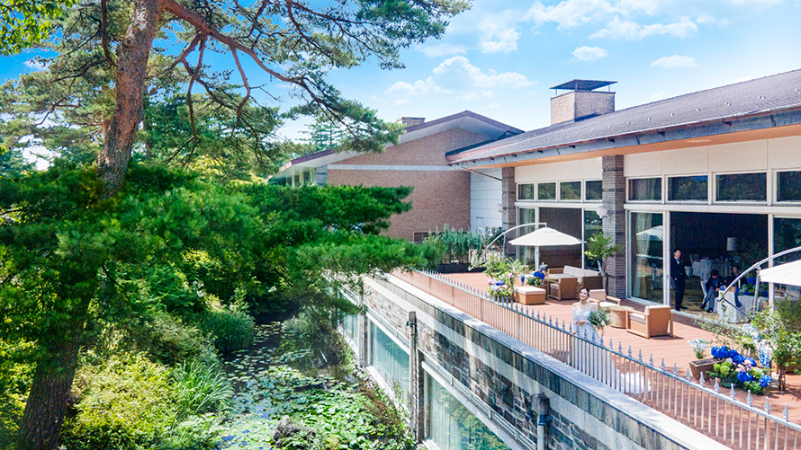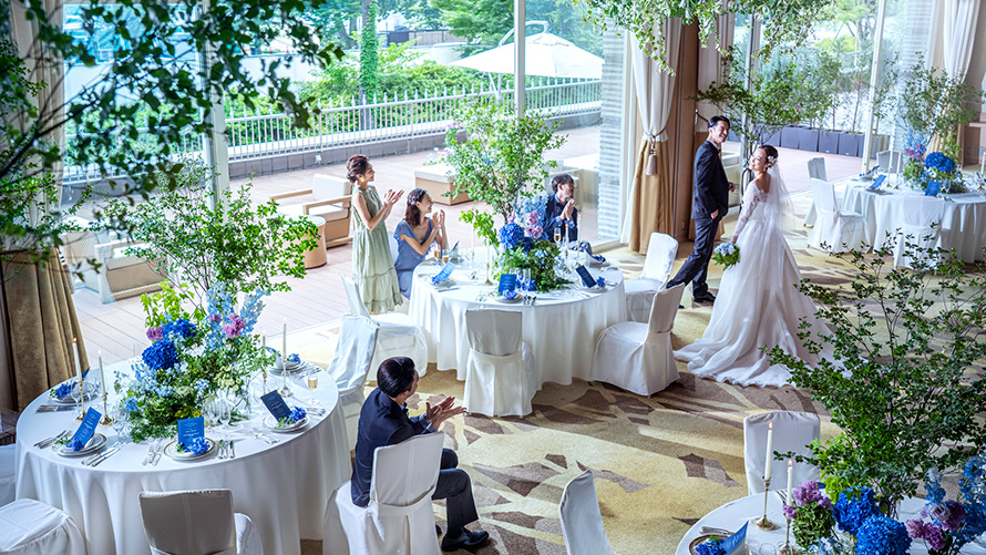 大きな窓の外にはウェルカムパーティーやケーキカットなど多彩な演出を楽しめるテラスが広がり、パーティー演出の幅がさらに広がります。