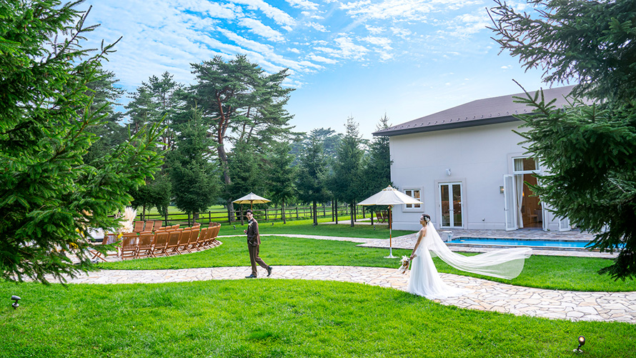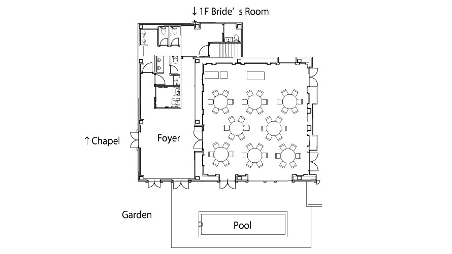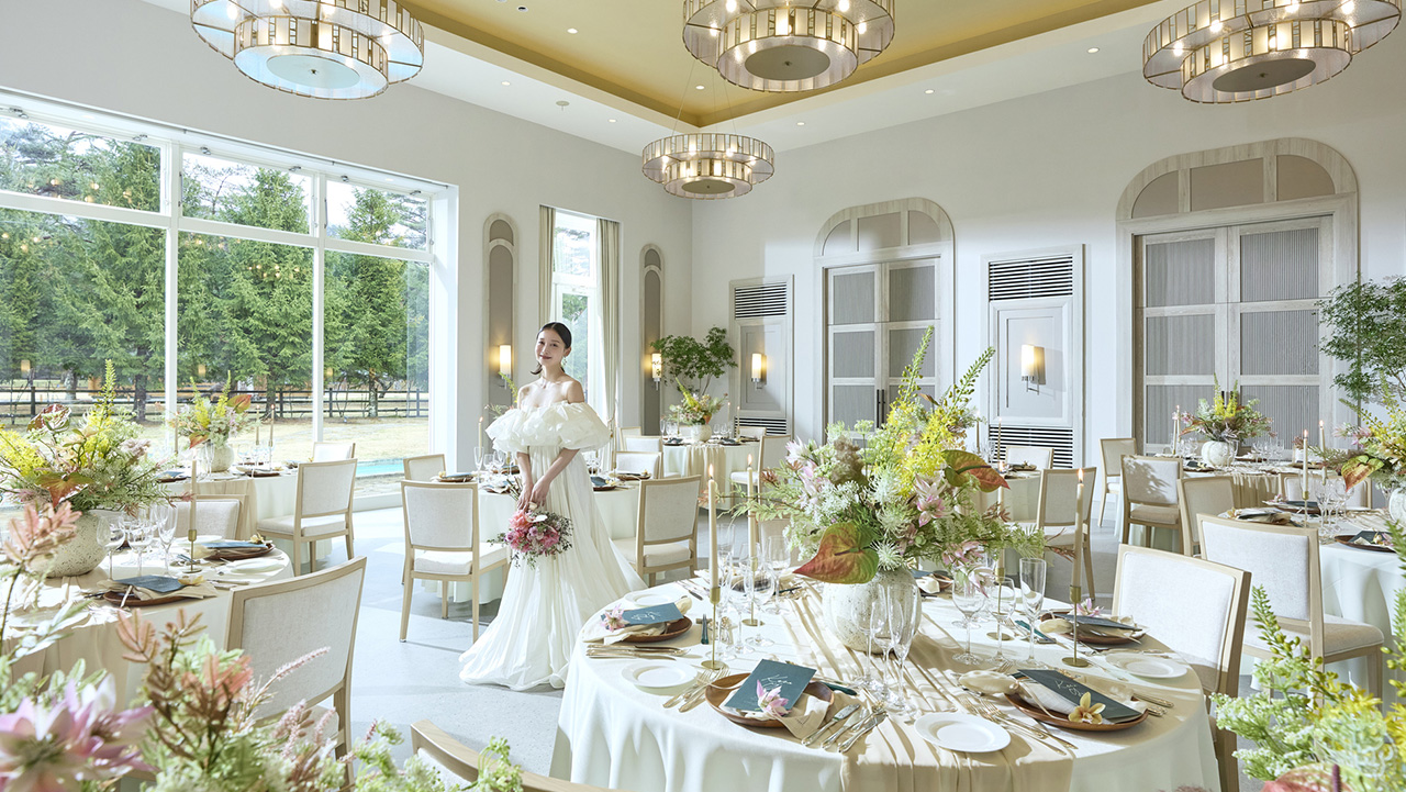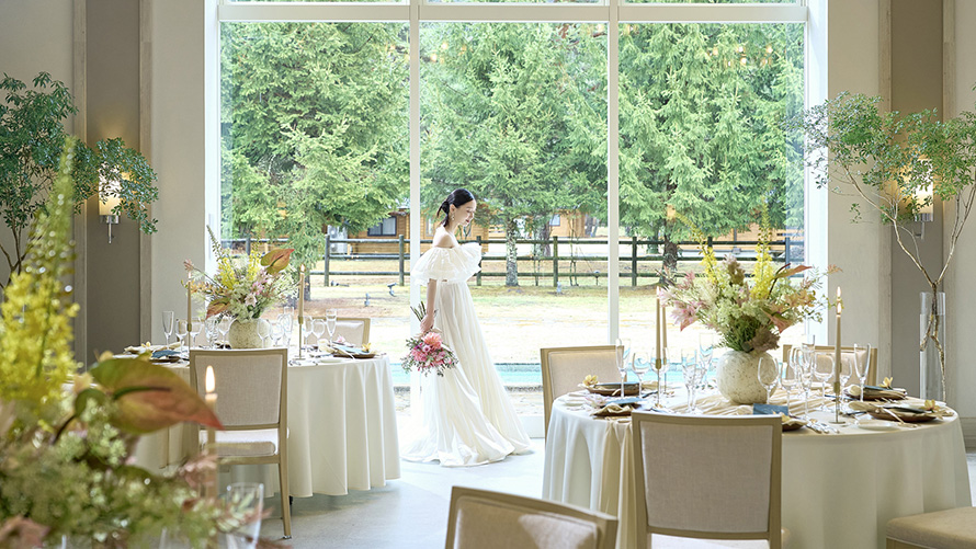 「風の教会」と同じ円形の照明に真っ白な壁は自然光が反射する明るい空間。スタイリッシュさも取り入れたデザインで様々なコーディネイトが楽しめる。