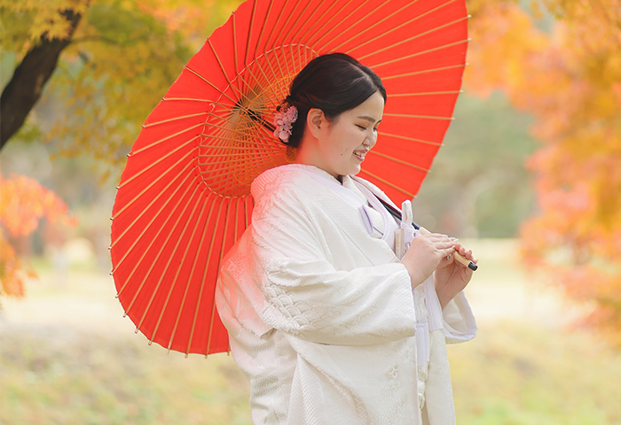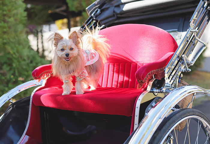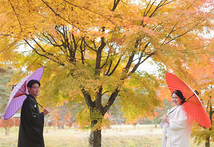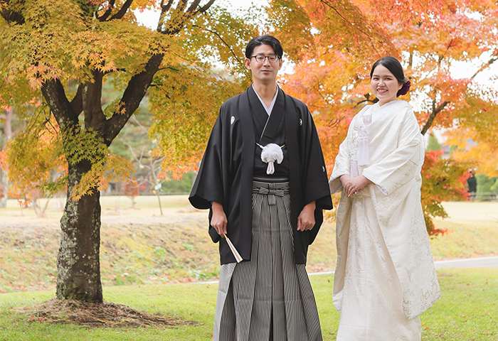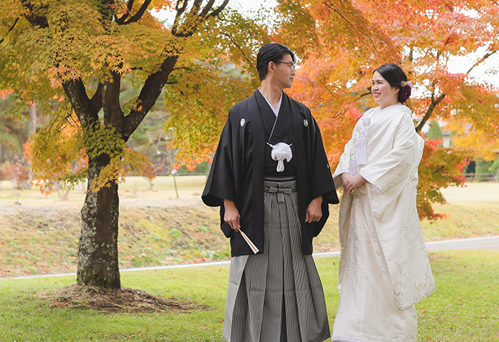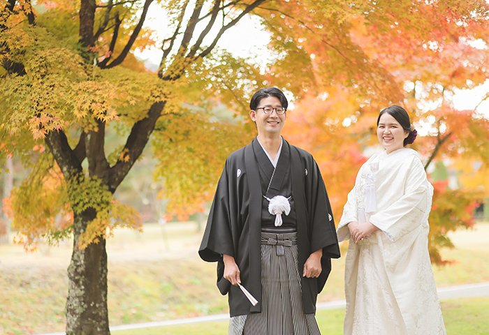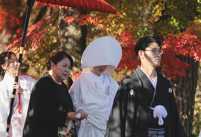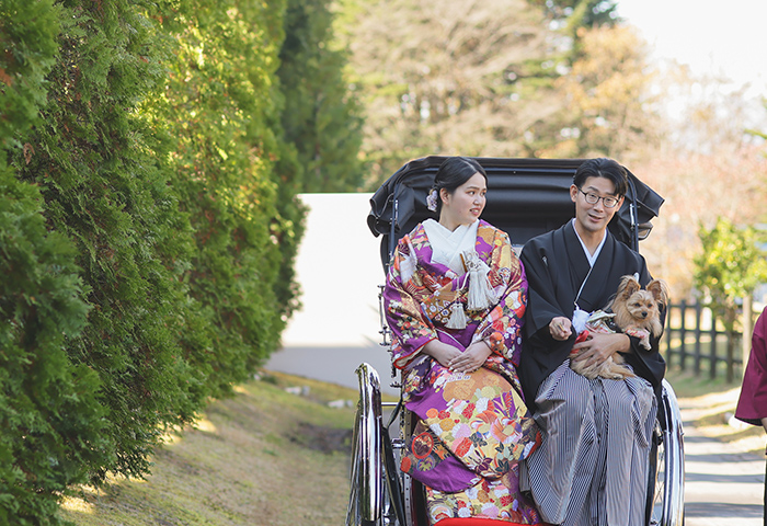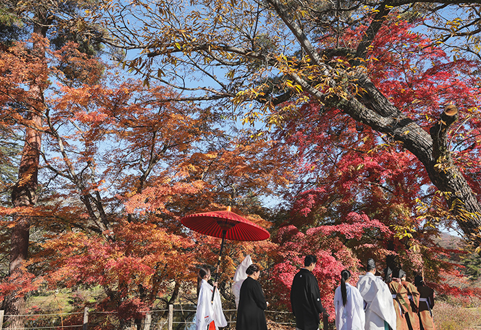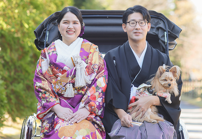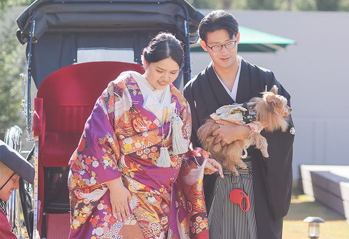 <2024年11月レポート>紅葉の中で白無垢と紋付袴が映える神前式、愛犬と一緒に人力車で入場も